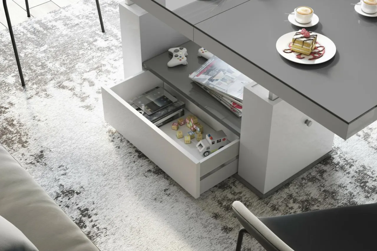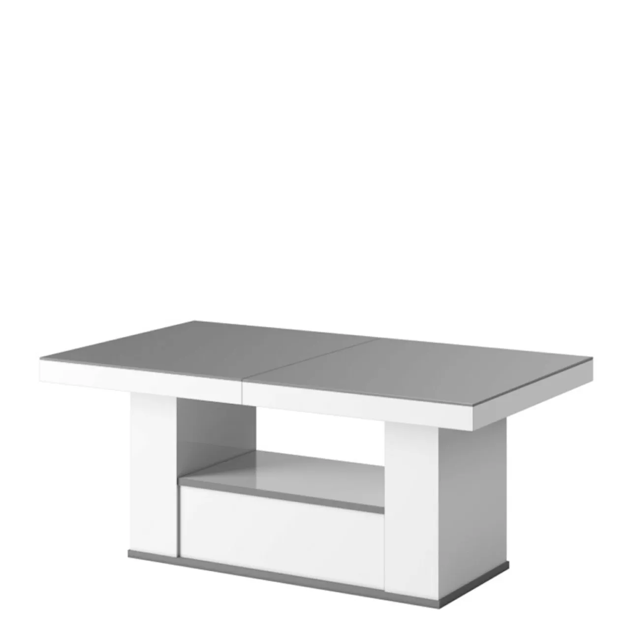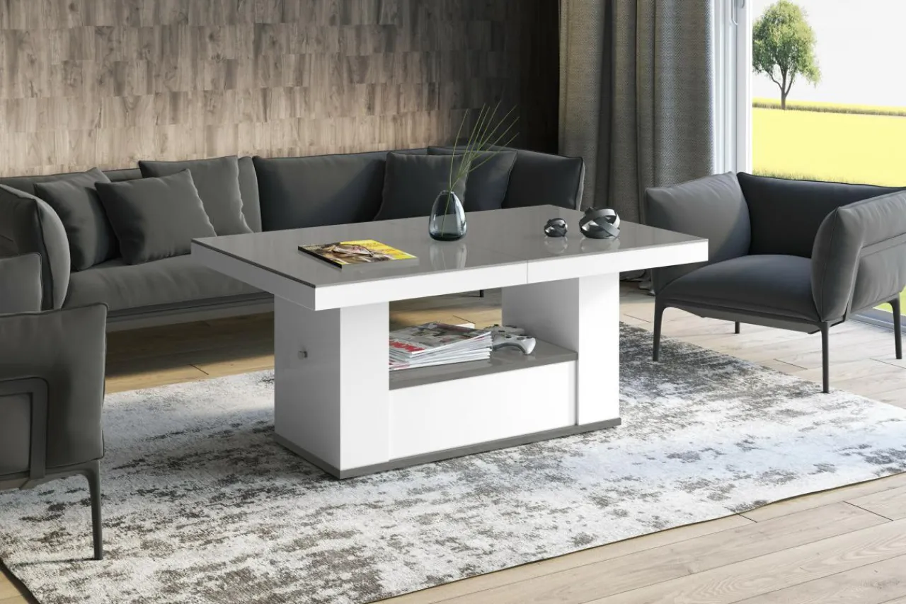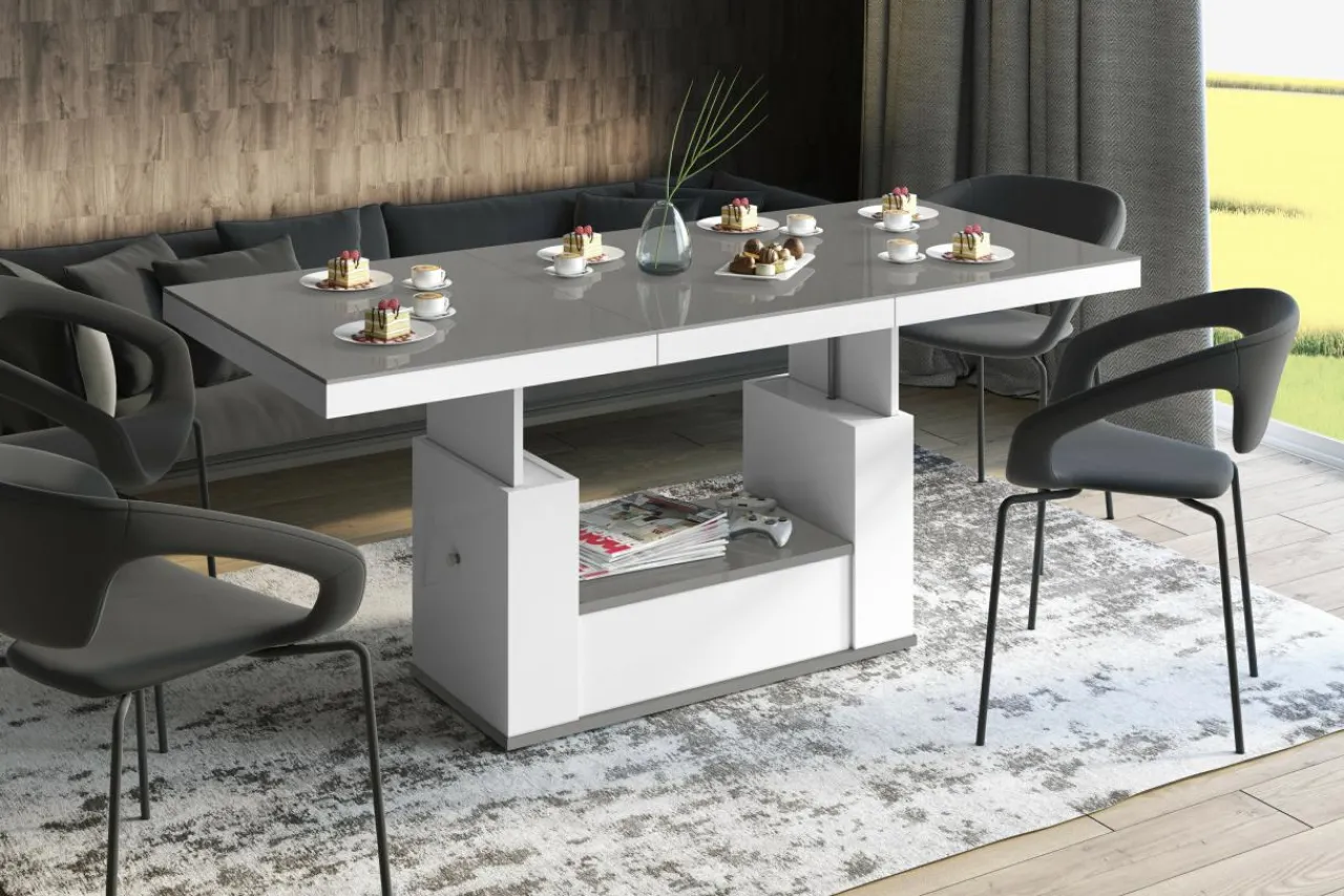 Nowoczesny ławostół MALAGA łączy w sobie 2 funkcje – niską ławę można szybko zamienić w stół jadalniany.