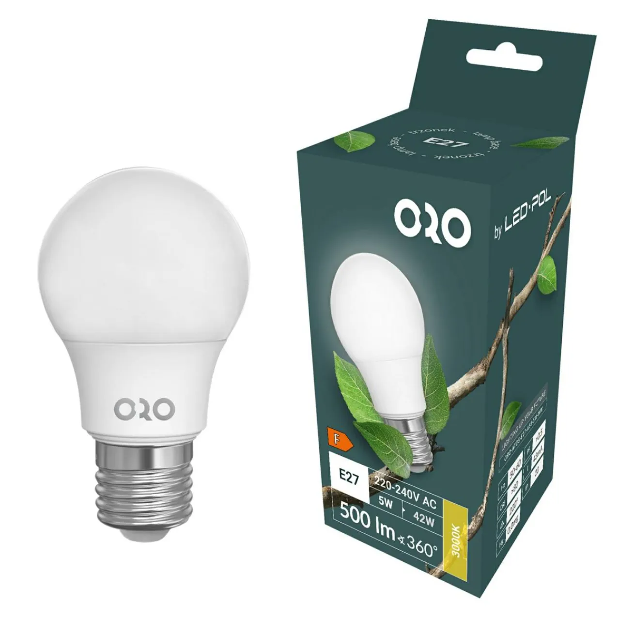 Żarówka ORO-ATOS-E27-A55-5W-WW emituje intensywne światło o strumieniu 500 lumenów (odpowiednik dawnej 42-watowej żarówki).