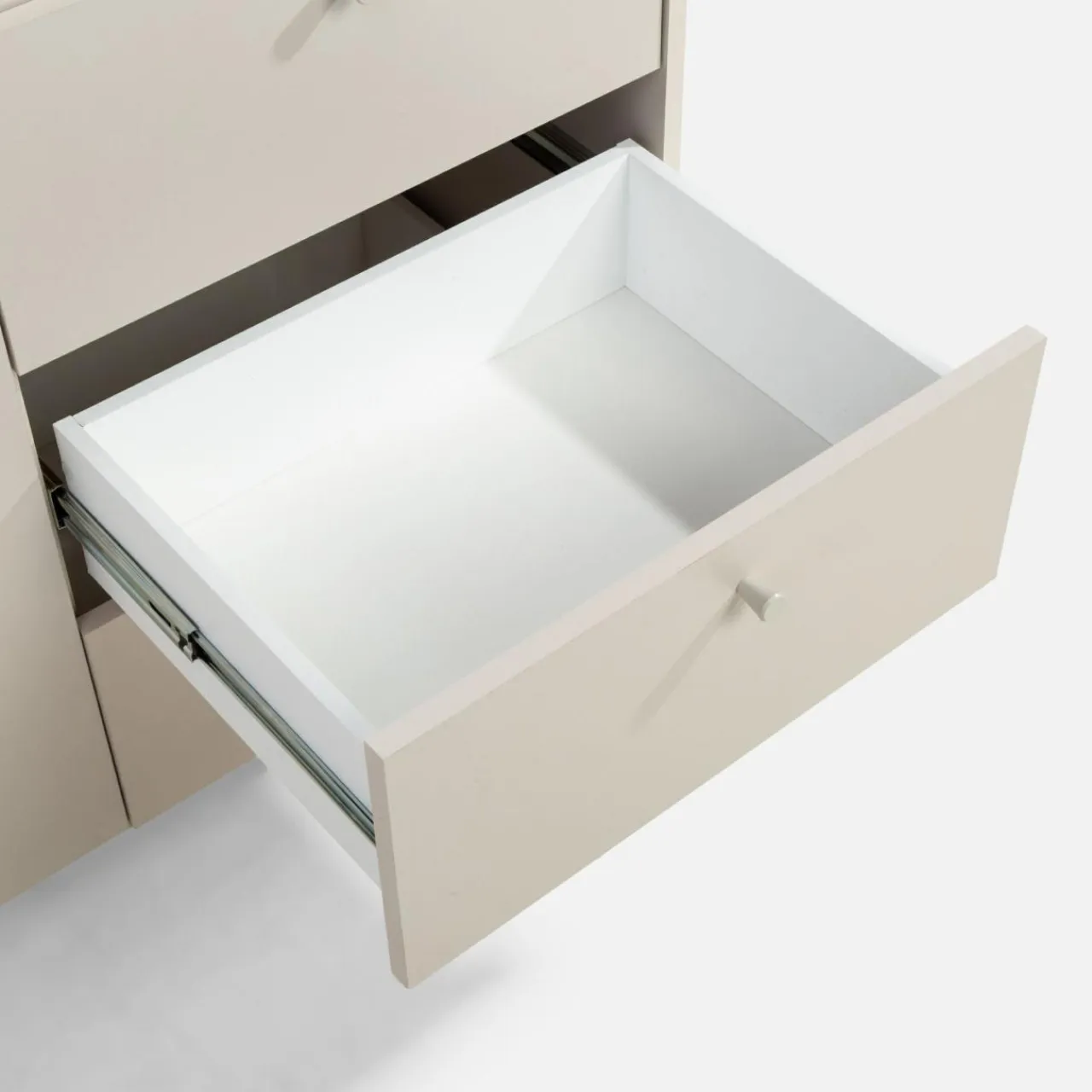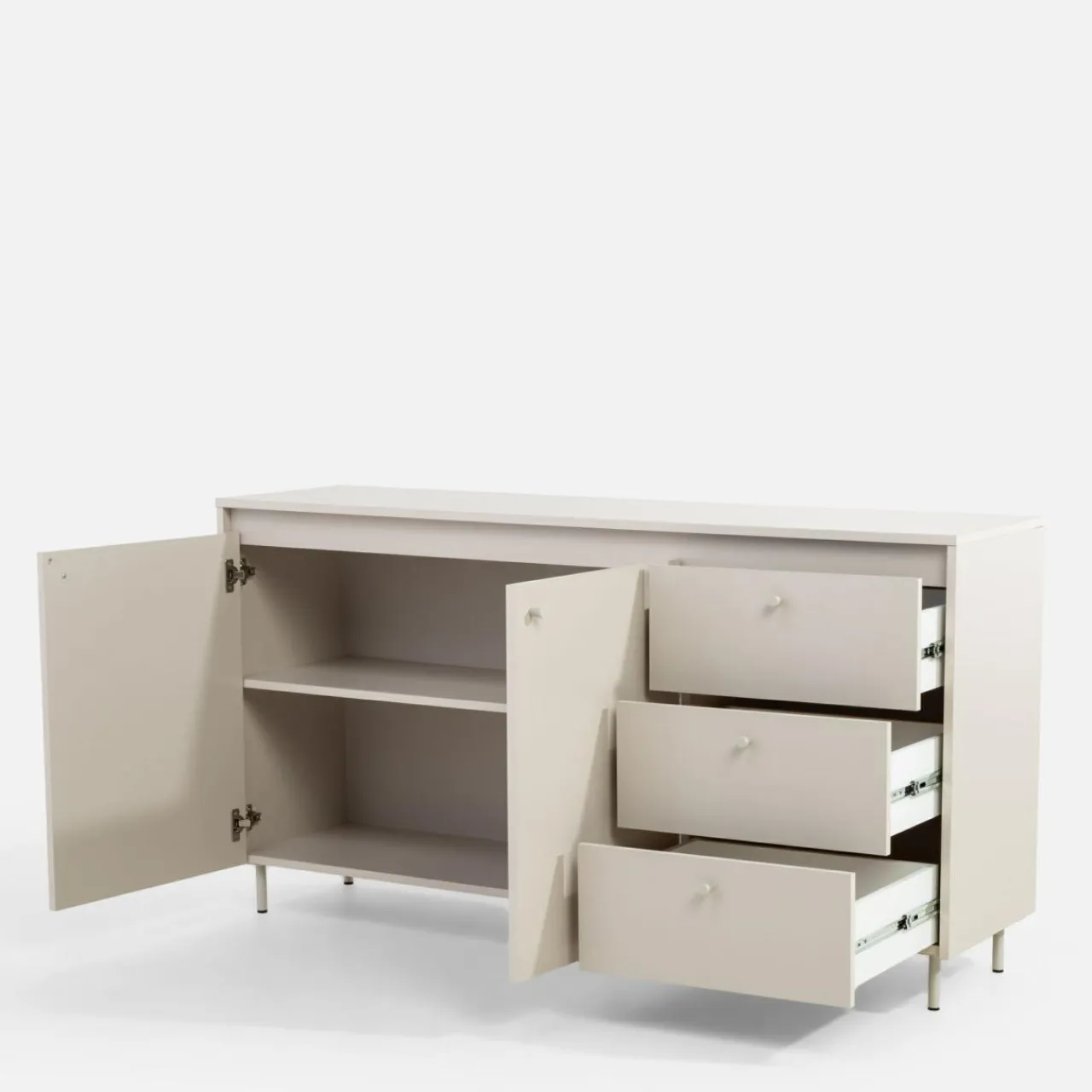 Komoda TORINO w kolorze kaszmir wprowadza subtelną elegancję do wnętrz w stylu skandynawskim lub minimalistycznym. Jej stonowany odcień doskonale współgra z ciepłym drewnem, beżami, szarościami oraz akcentami w kolorze czarnym lub złotym.