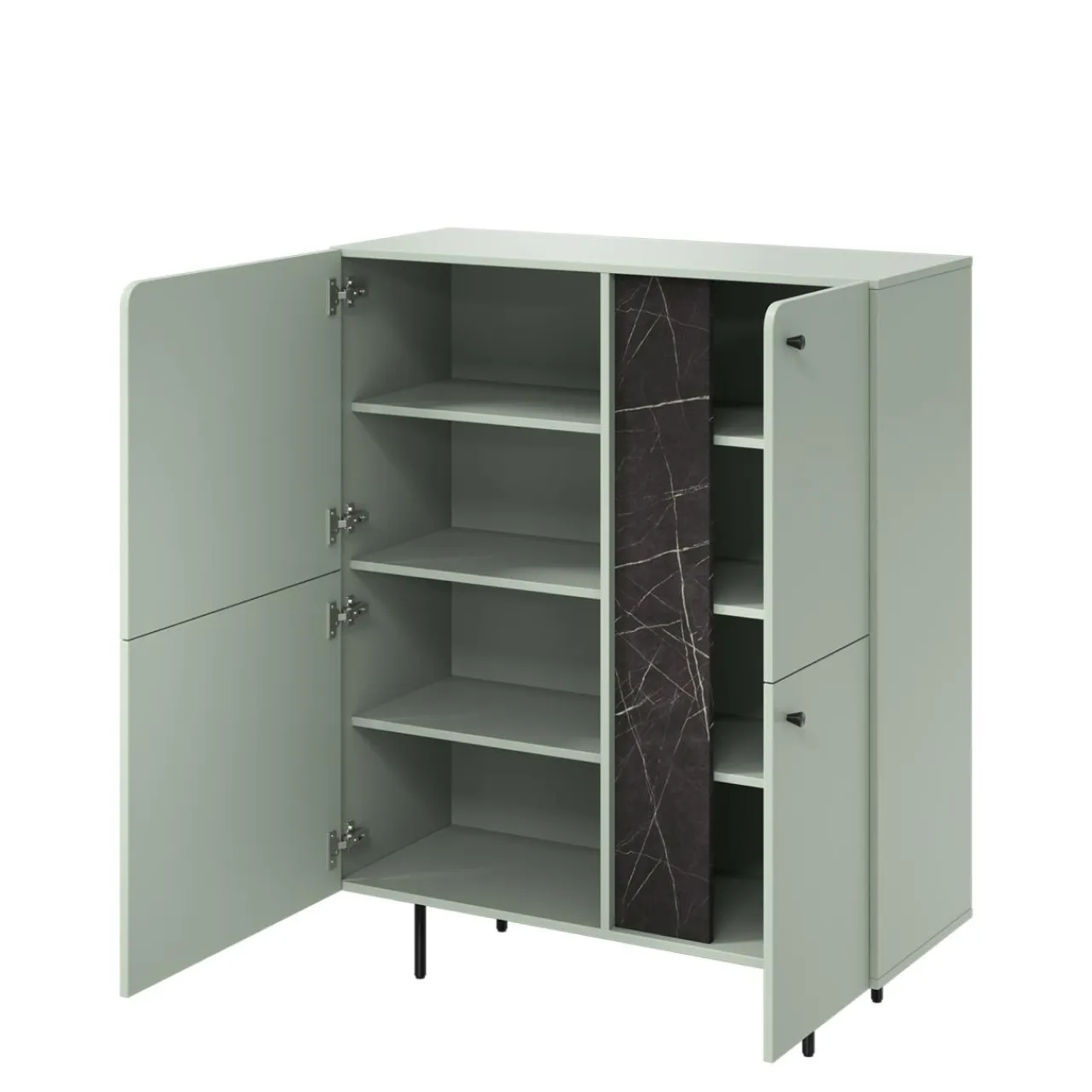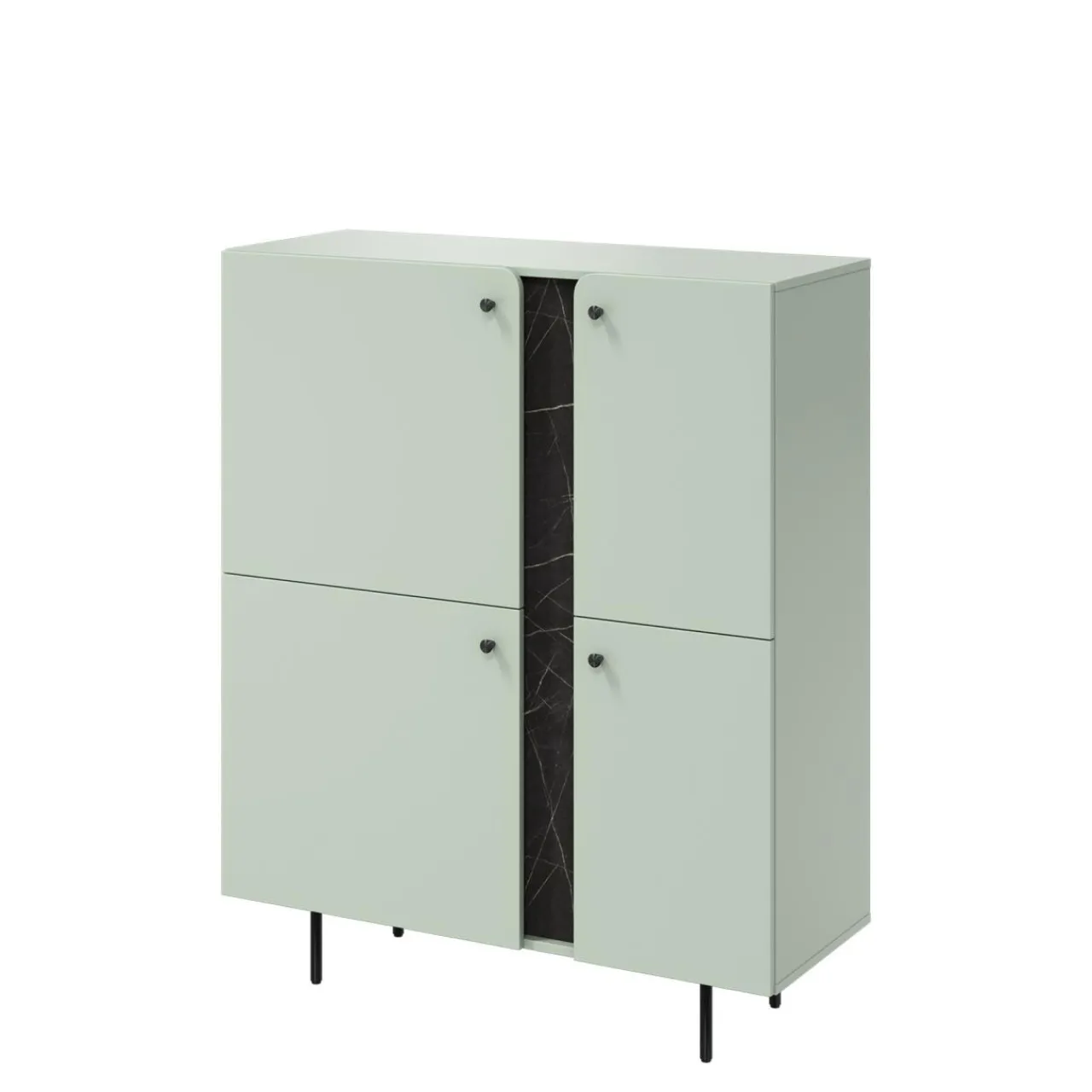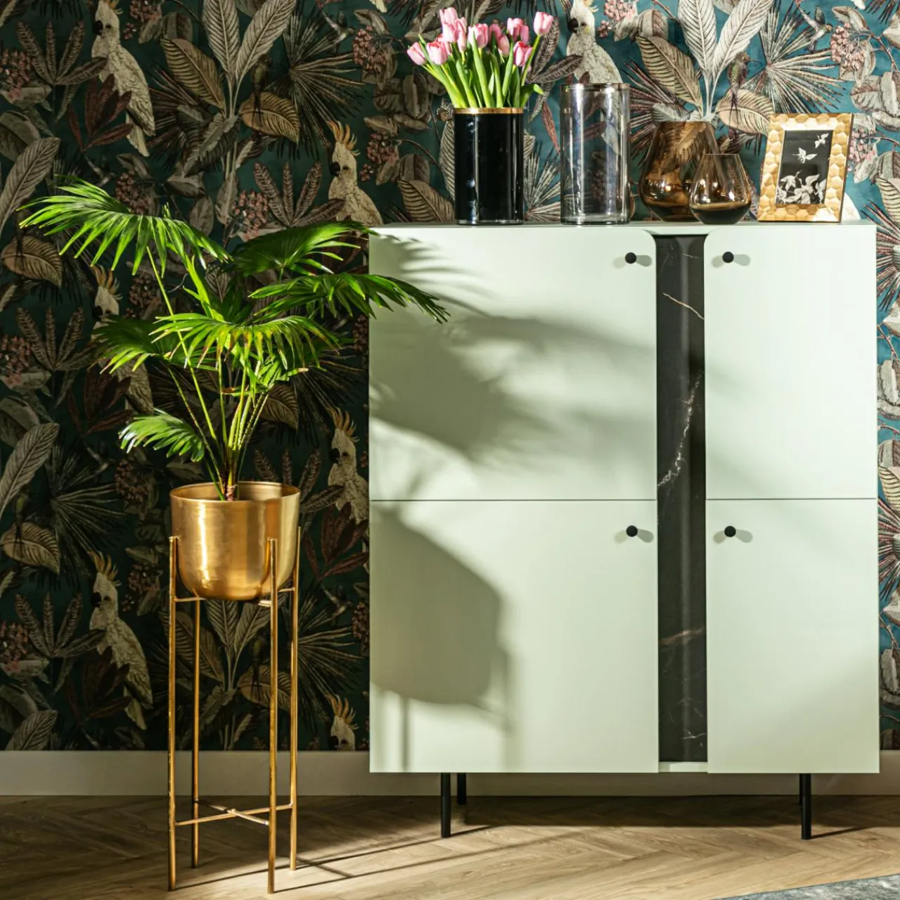 - Szałwiowe meble świetnie sprawdzą się łagodnej, industrialnej aranżacji. Surowa ściana, marmurkowe dekoracje to idealne tło. Dołóż pnące się rośliny, drewniane palety i czarno-białe dodatki, a uzyskasz efekt artystycznego salonu.