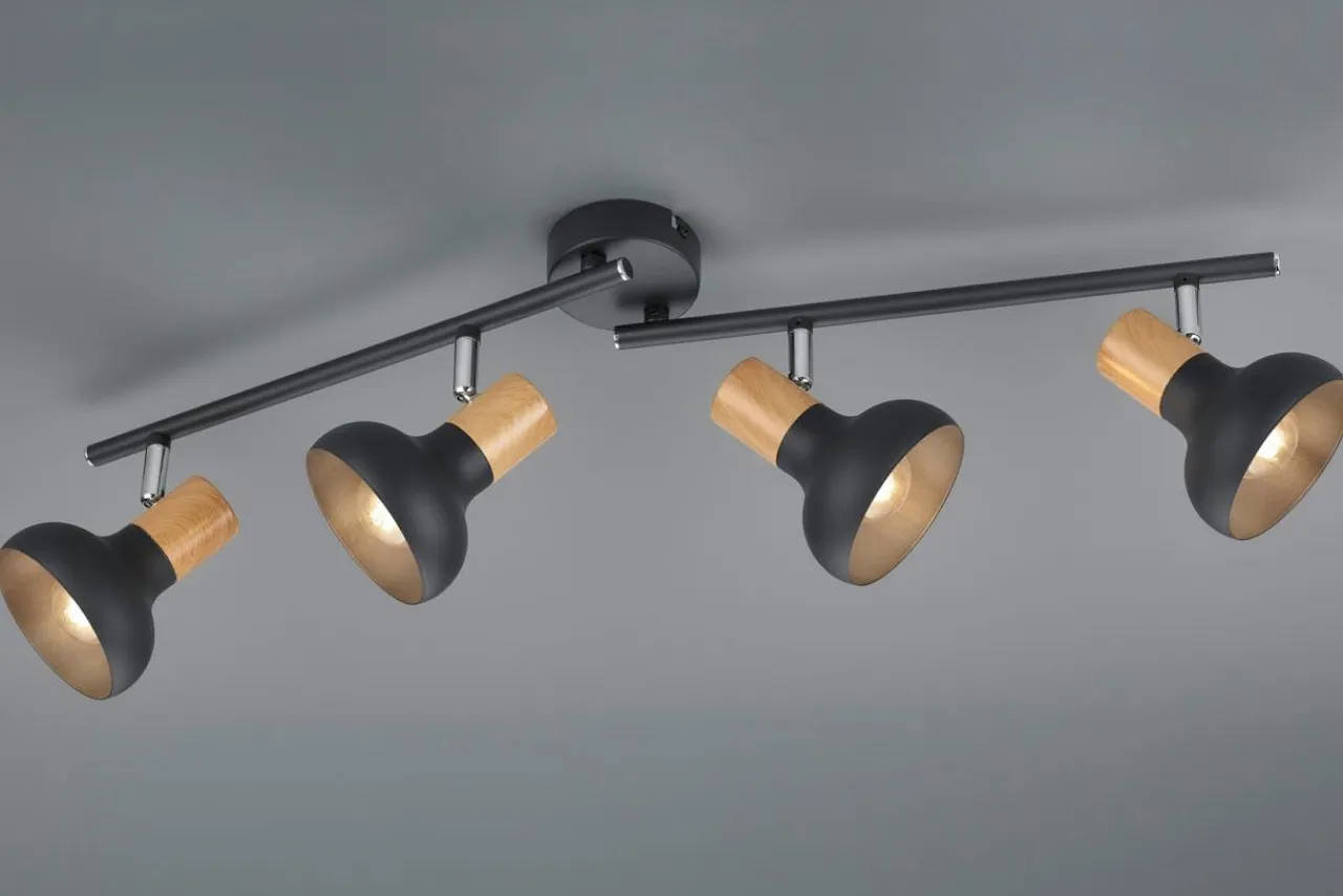 Ozdobna część wykonana w kolorze jasnego drewna doskonale komponuje się z ciepłą kolorystyką mebli oraz dodatków dekoracyjnych, którą dodatkowo podkreślą baza i klosze w czarnym, matowym kolorze.