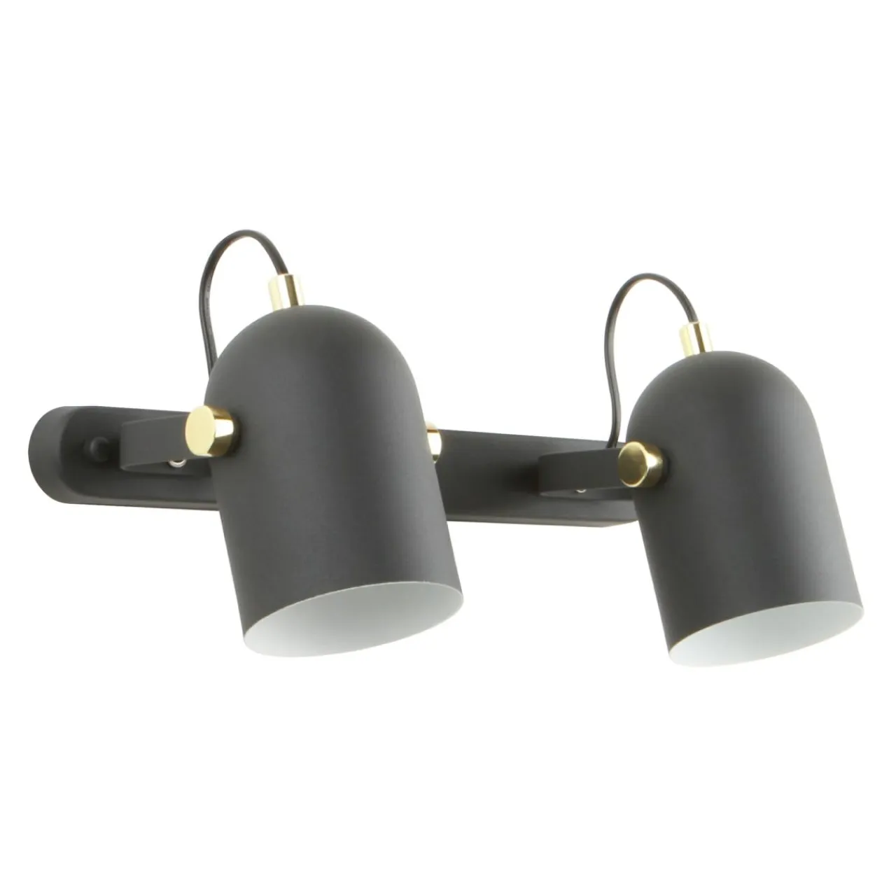 2-punktowa ARIES posiada podstawę w formie listwy, z przymocowanymi do niej metalowymi widełkami, które podtrzymują stylizowane na reflektory klosze. Czarne, matowe wykończenie lampy jest przełamane połyskującymi elementami w złotym kolorze.