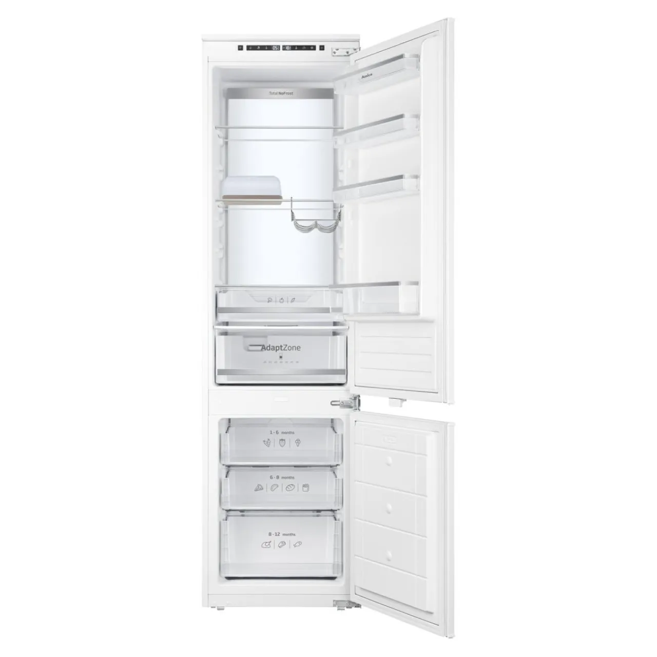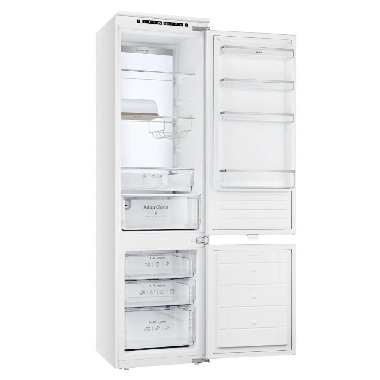 Technologia No Frost zapewnia stałą kontrolę poziomu wilgotności zarówno w chłodziarce, jak i zamrażarce. Oznacza to brak szronu i lodu w środku urządzenia.