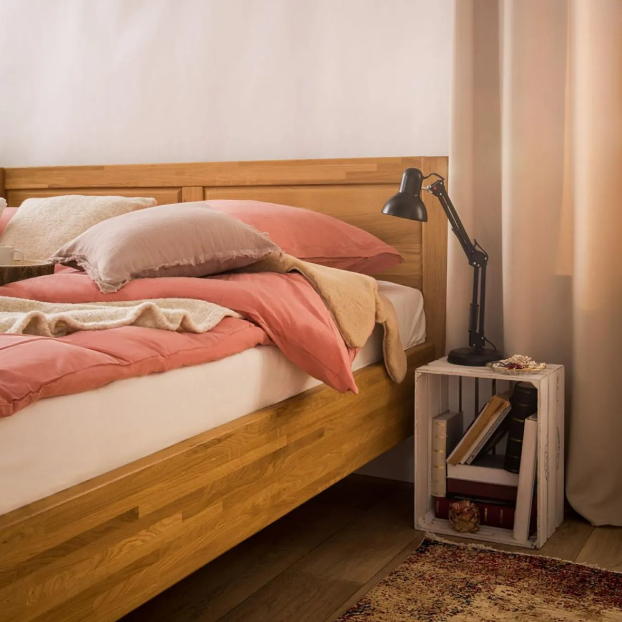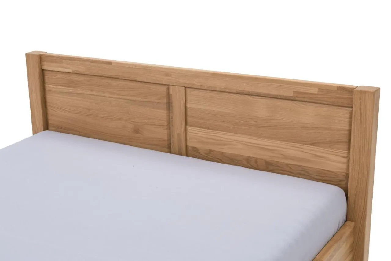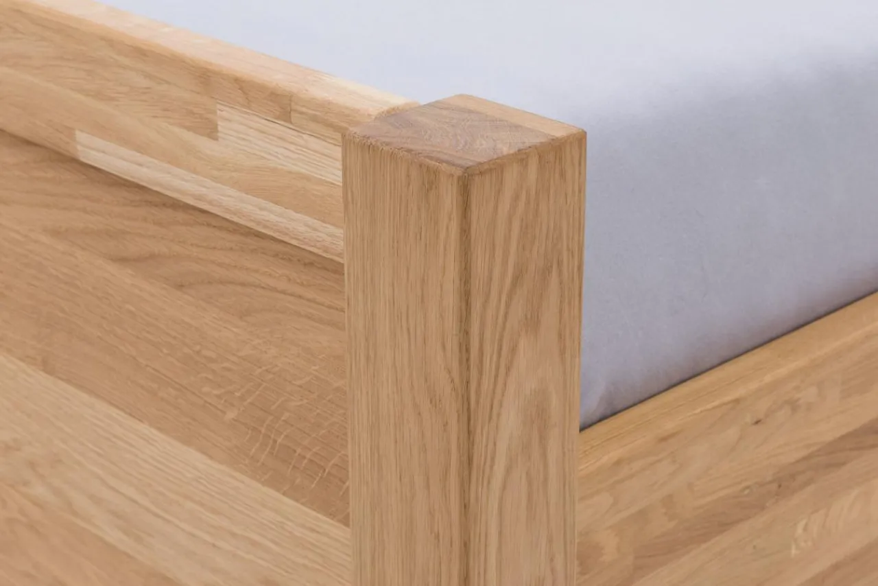 Łóżko zostało zabezpieczone jasnym olejem, który podkreśla naturalne piękno struktury drewna.