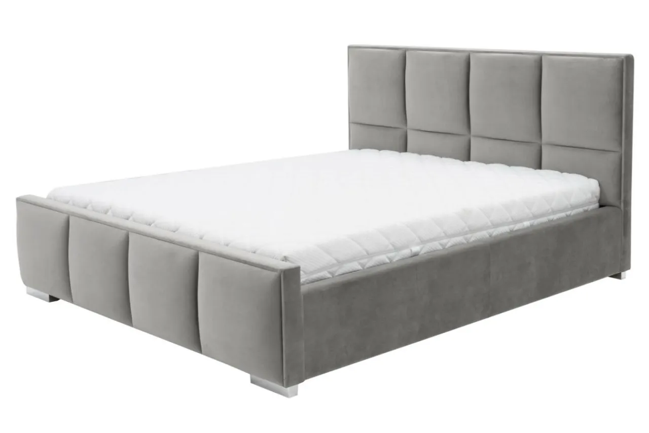 - Łóżko obite jest tkaniną w stalowym kolorze. Welurowa powłoka odbija światło, dzięki czemu odcień zmienia się w zależności od intensywności oświetlenia.