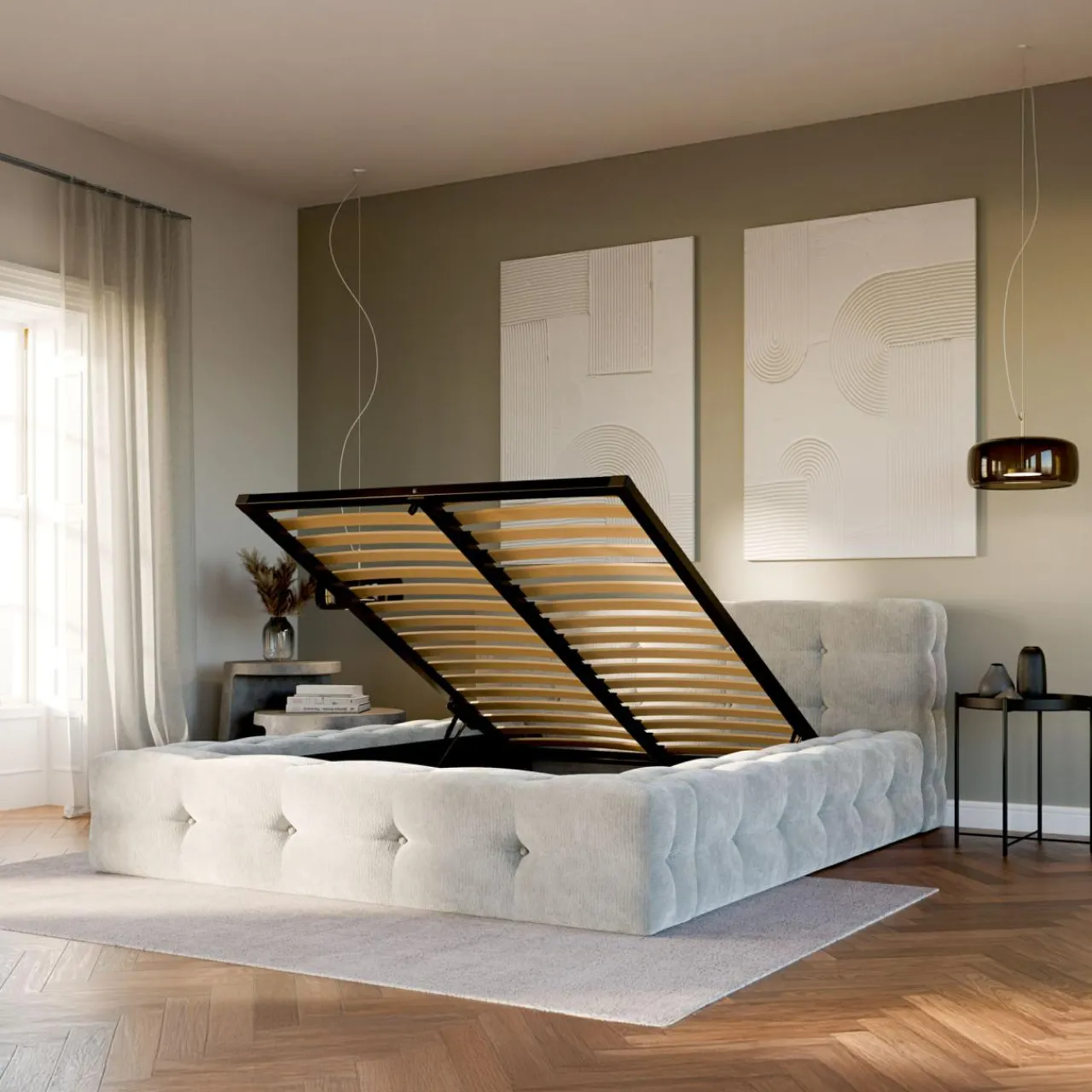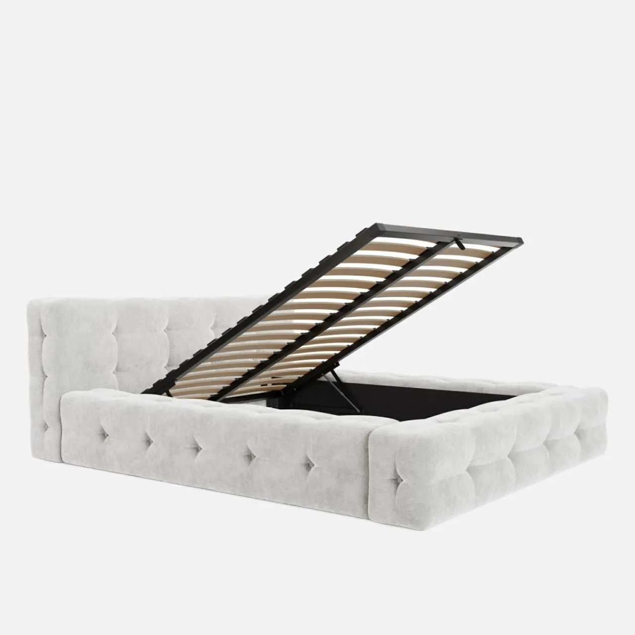- Pojemnik pod stelażem da Ci wygodna przestrzeń na pościel i inne domowe tekstylia.