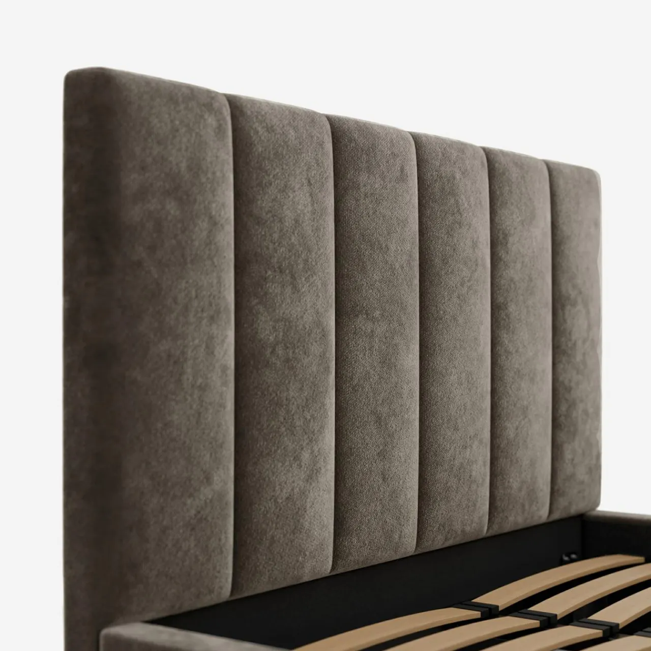 Łóżko STELLA pokryto miękką, brązową tkaniną, która doda ciepła do Twojej sypialni. Oprzyj się na miękkim wezgłowiu i złap oddech przed snem.