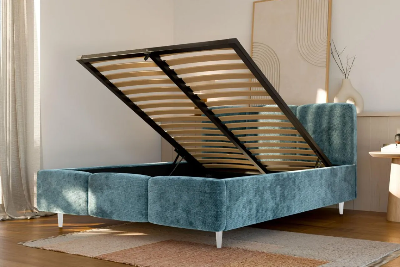 - Pojemnik pod stelażem da Ci przestrzeń, w której przechowasz pościel i inne domowe tekstylia. Dostęp do niego ułatwi Ci podnośnik gazowy.