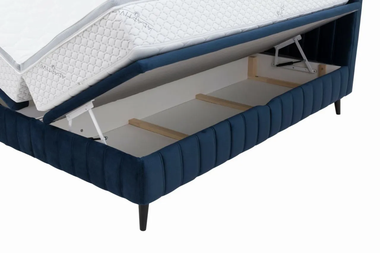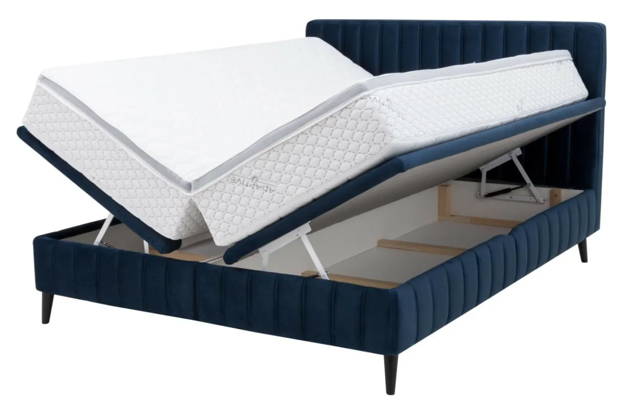 Szukasz gotowego rozwiązania do eleganckiej sypialni? Lubisz otaczać się przyjemnymi w dotyki tkaninami i barwami o intensywnych odcieniach? Zachwyci Cię łóżko kontynentalne CAYA, bo jest wyposażone w wygodny materac i pokryte granatową, welurową tkaniną.