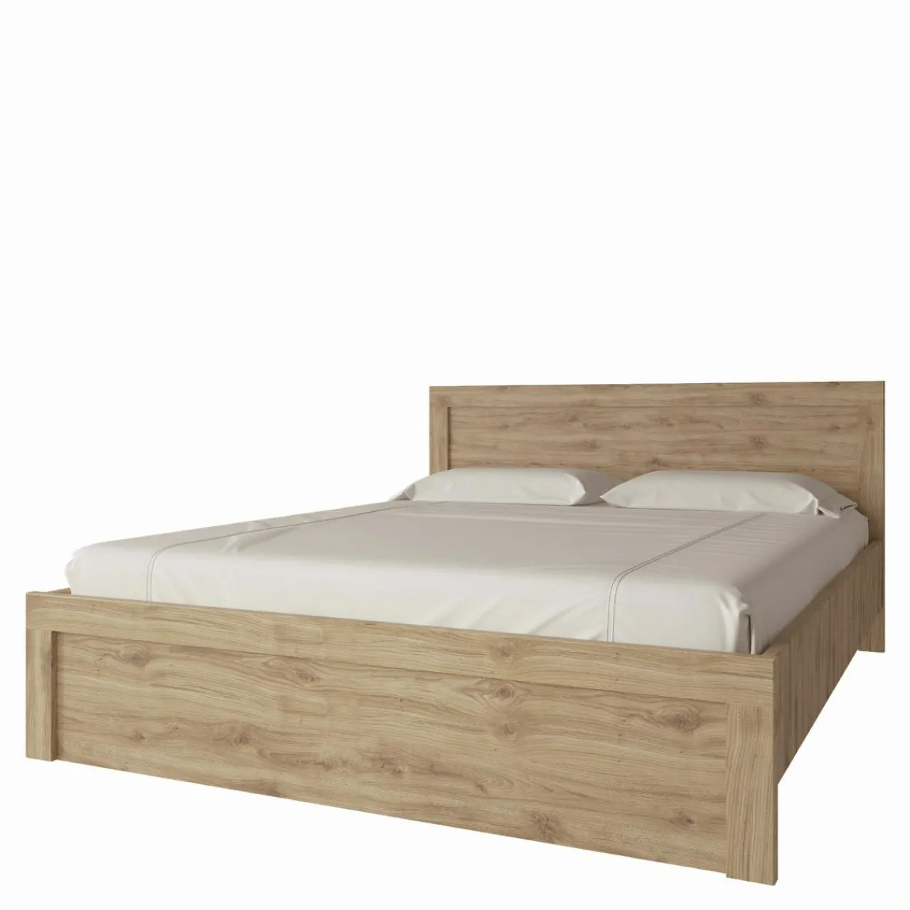 - Korpus i rama łóżka wykonane są z płyty meblowej w kolorze jasnego drewna.