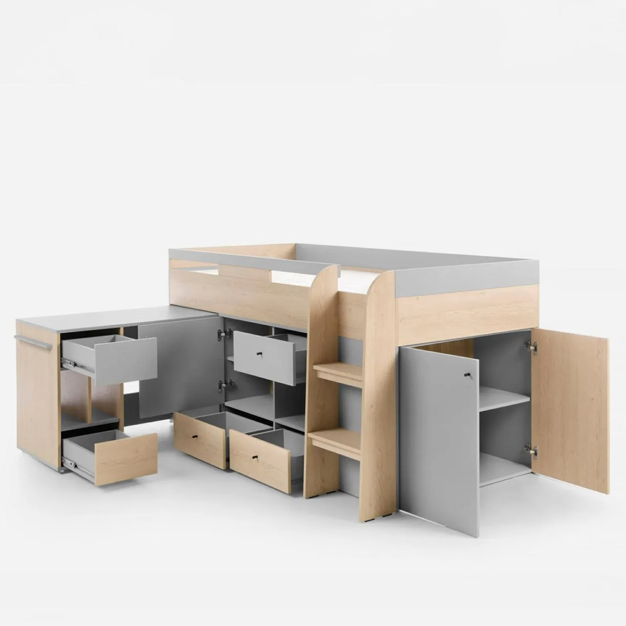 Łóżko ORO to coś więcej niż miejsce do spania. W swojej zabudowie posiada biurko oraz półki, szafki i szuflady, które zaoszczędzą przestrzeń w mniejszych pokojach.