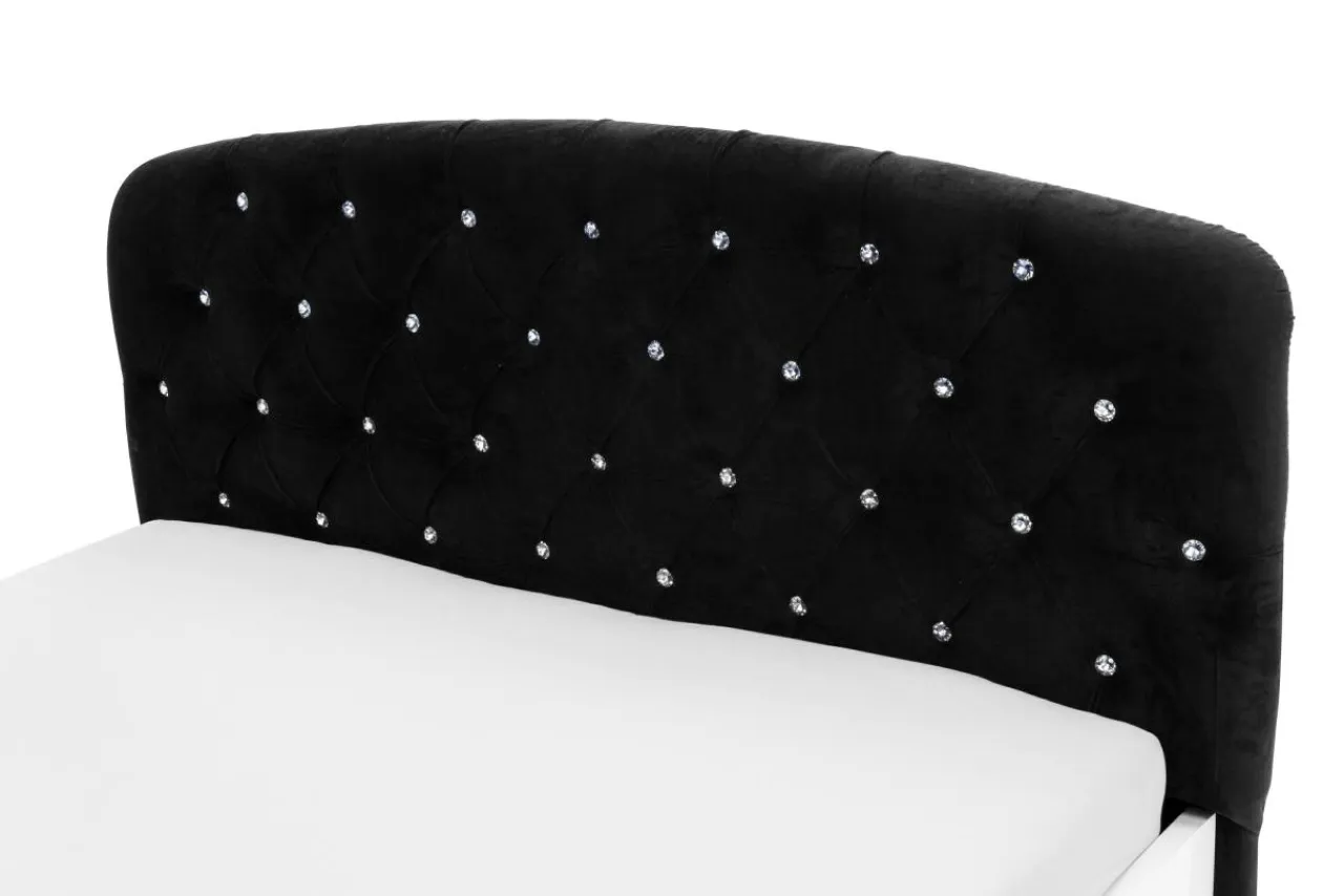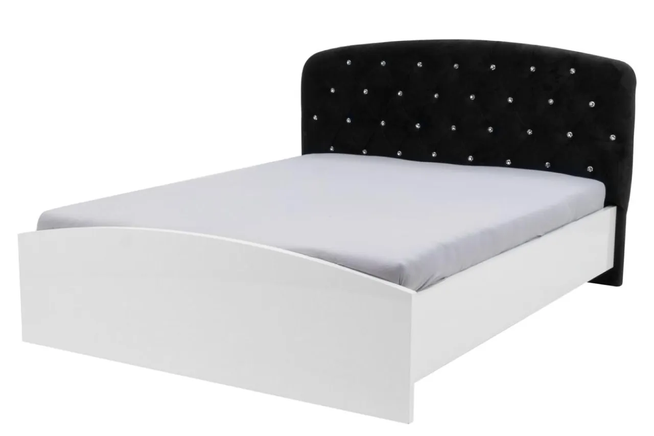 Elegancki pikowany zagłówek, z przyjemnej w dotyku welurowej tkaniny, nadaje łóżku luksusowy charakter. Boki oraz dolny szczyt łóżka zostały wykończone białym lakierem w połysku.