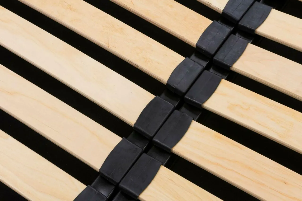 - Stelaż tworzy 48 listewek ze sklejki bukowo – brzozowej, umieszczonych w koszulce w tworzywa na metalowych profilach.