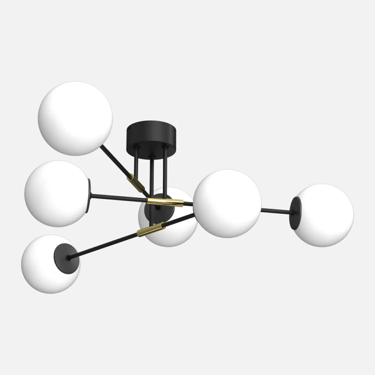 - Oprawa wykończona czarnym kolorem z ozdobnym dodatkiem złota została dopełniona przez 6 kloszy w odcieniu mlecznej bieli – to zestawienie dopasujesz do wnętrz, ciążących w stronę loftowej estetyki.