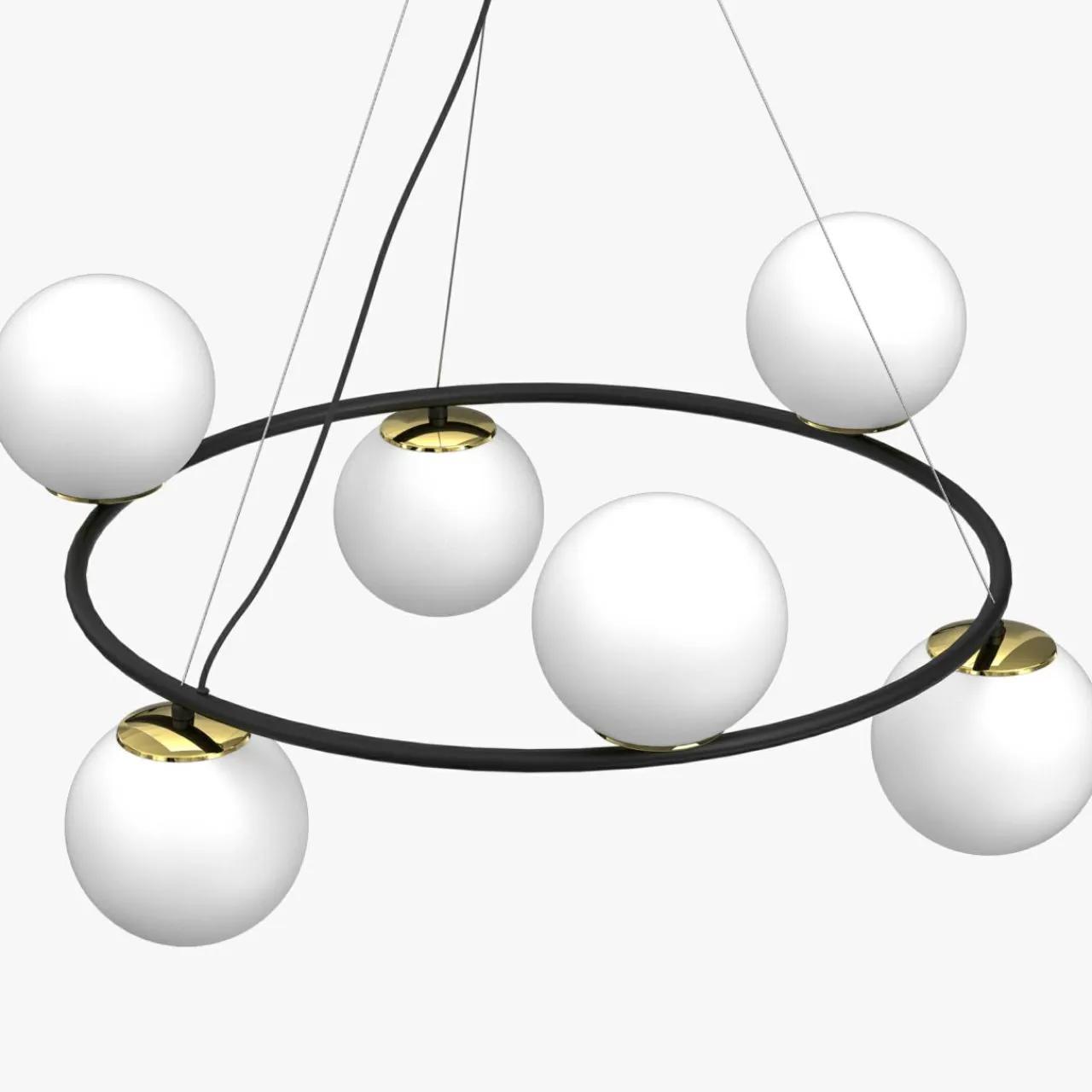 Jej czarna oprawa o kształcie okręgu została udekorowana 4 kulistymi kloszami, które rozświetlą przestrzeń i dodadzą pięknego wykończenia wnętrzu Twojego mieszkania.