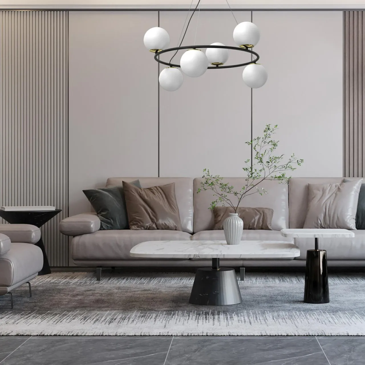 - Zestawienie czarnej oprawy z białymi kulami kloszy to doskonałe wykończenie dla nowoczesnego wnętrza.