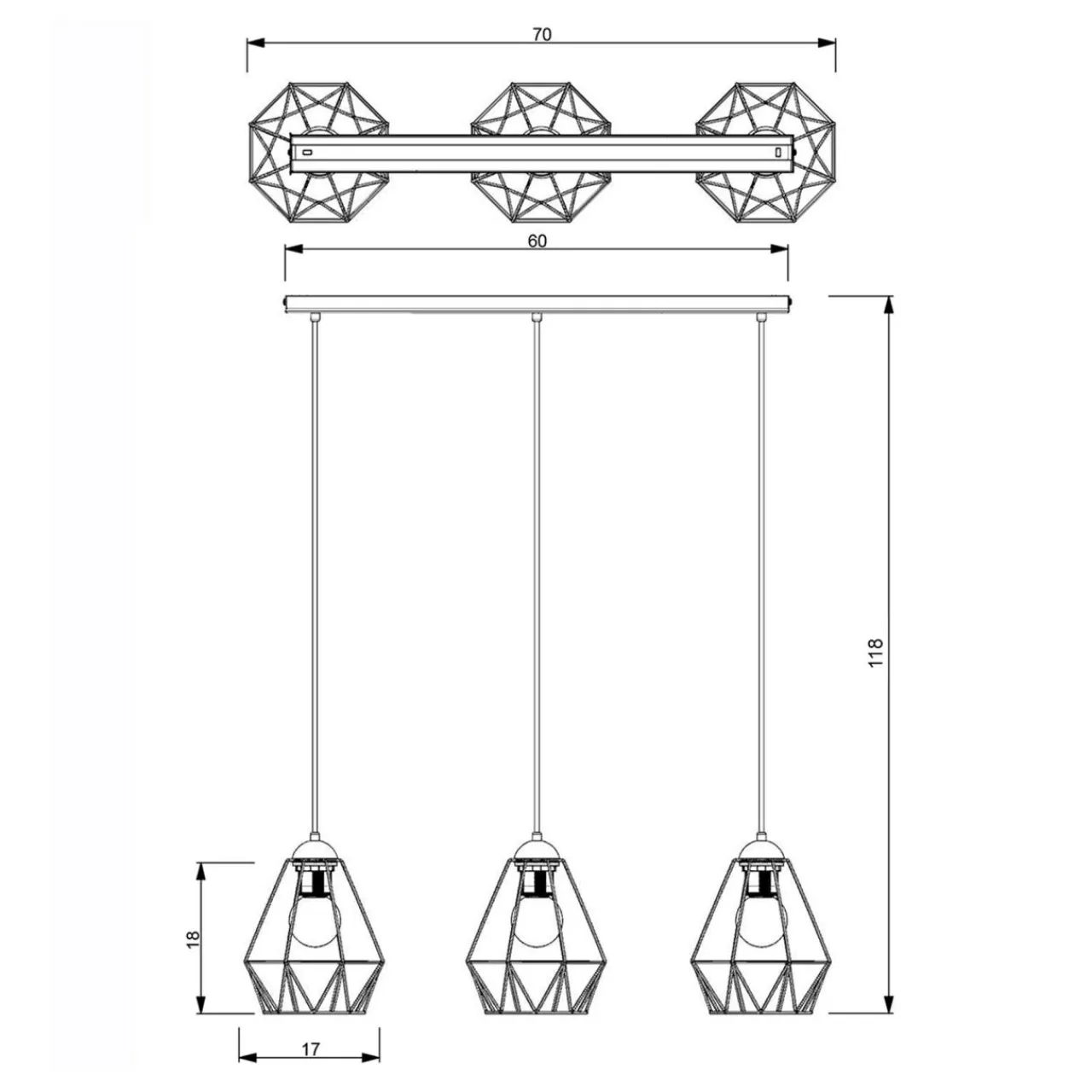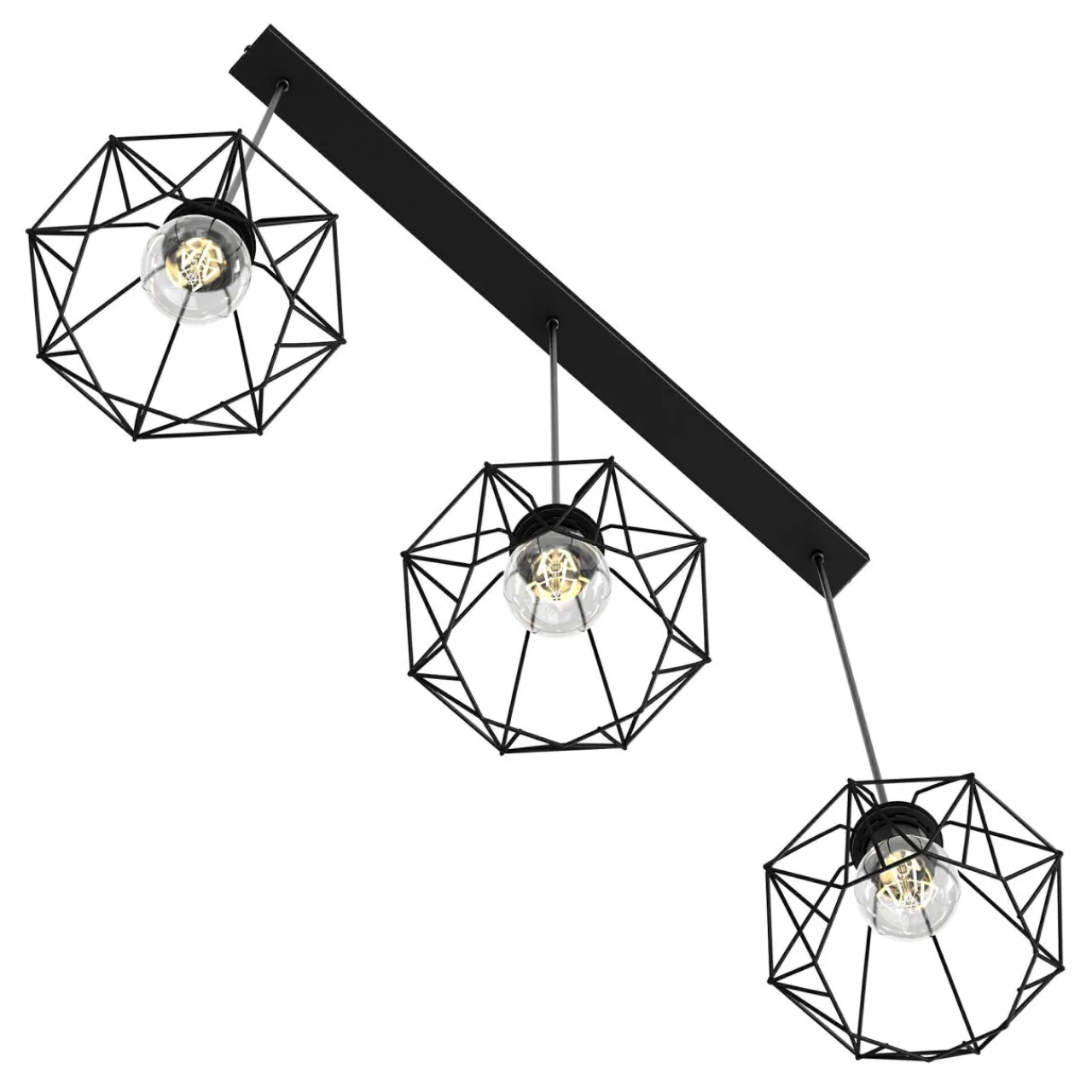 Klosze złożone ze starannie połączonych metalowych elementów tworzą geometryczną konstrukcję, która doskonale prezentuje się w połączeniu z ozdobnymi żarówkami o standardowej wielkości. Ich zamontowanie doskonale podkreśla walory pomieszczenia i nadając wnętrzu ciekawy wizualnie efekt załamywania światła. Podstawa lampy – montowana do sufitu listwa – wykonana została z metalu wykończonego czarnym kolorem.