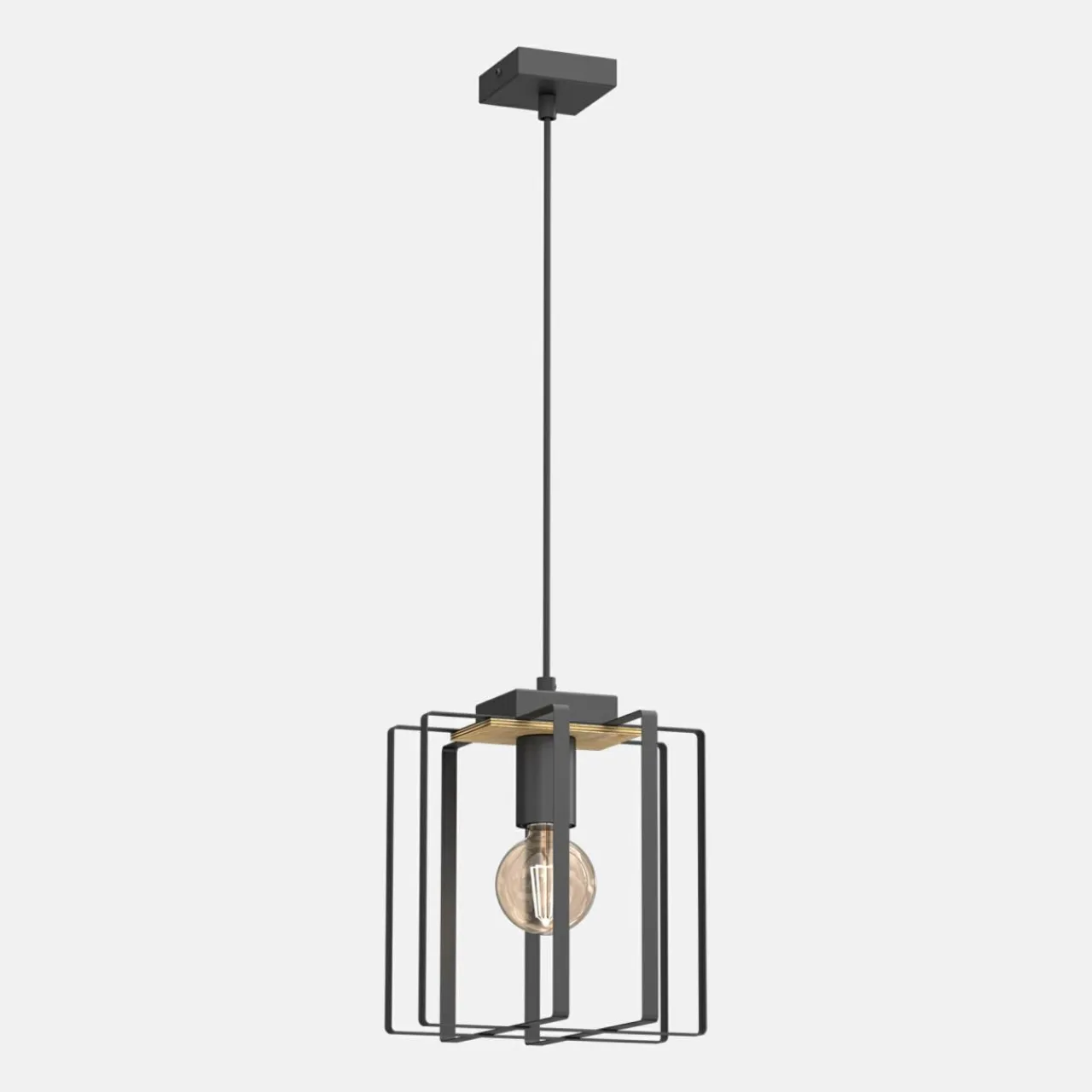- Wiszący model pojedynczej lampy KORTEZ to ciekawy design oprawy oparty na geometrycznych bryłach z widokiem na ozdobną żarówkę.