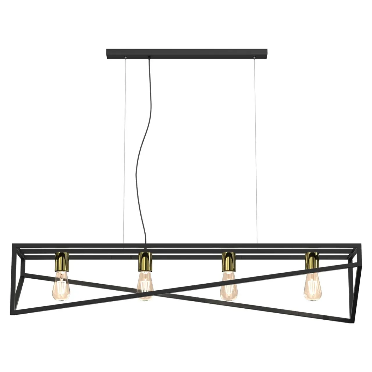 Ciekawie zaaranżowany kształt metalowej oprawy w czarnym, matowym kolorze oraz widoczne żarówki z kołnierzami wykończonymi złotym pobłyskiem sprawią, że Twoi goście nie będą mogli oderwać od niej spojrzeń.
