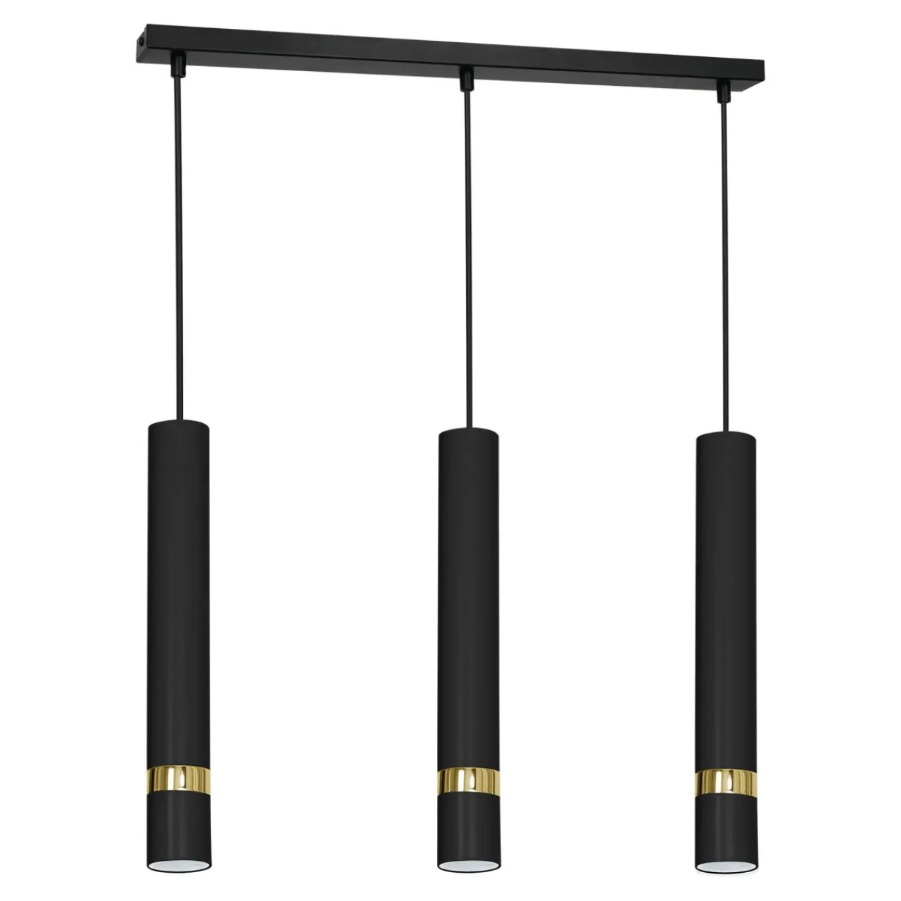 - Obudowa lampy w kształcie listwy z 3 skierowanymi pionowo w dół walcami została wykonana z lakierowanego metalu. Cechą charakterystyczną pierścienie w kolorze złota.