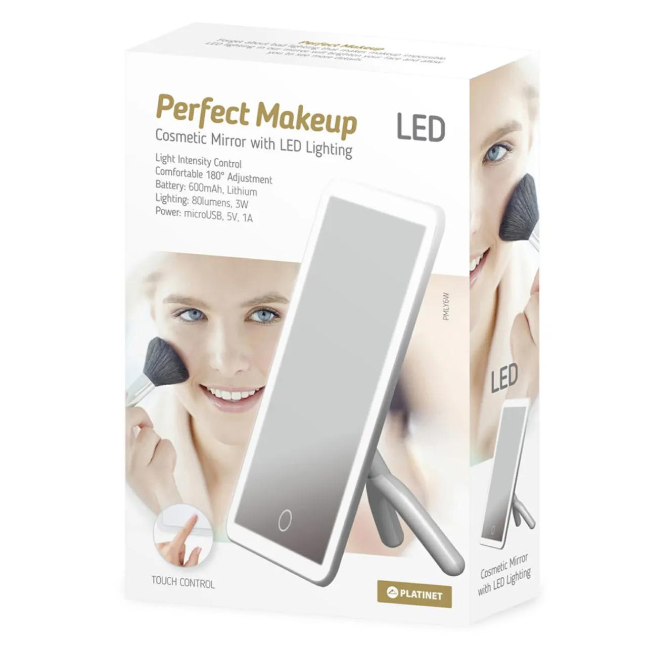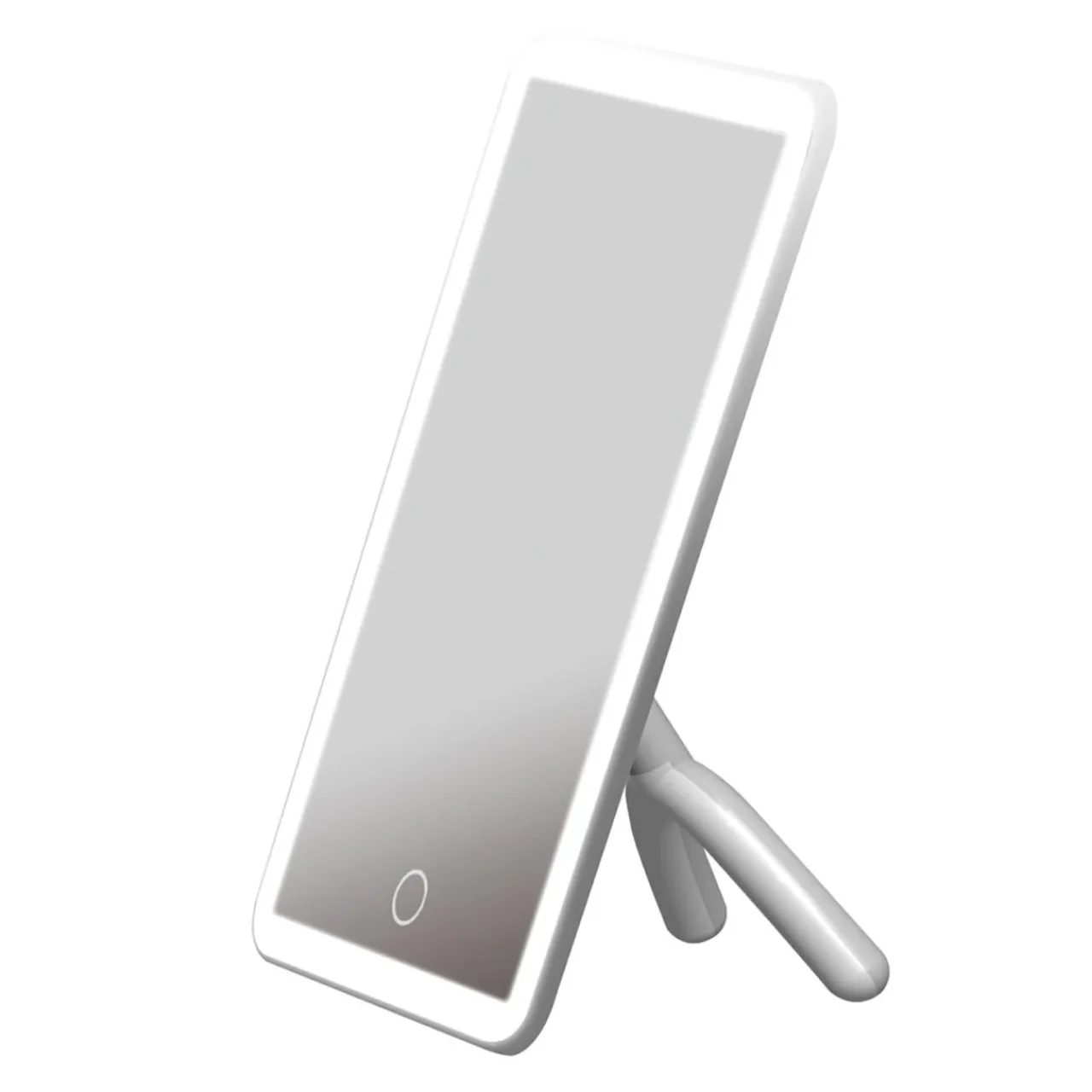 Posiada prostokątny kształt z wysuwaną nóżką, na której możesz je oprzeć. Dookoła tafli lustra znajduje się pasek LED, który po włączeniu generuje światło o mocy 3W i strumieniu świetlnym rzędu 80 lumenów.