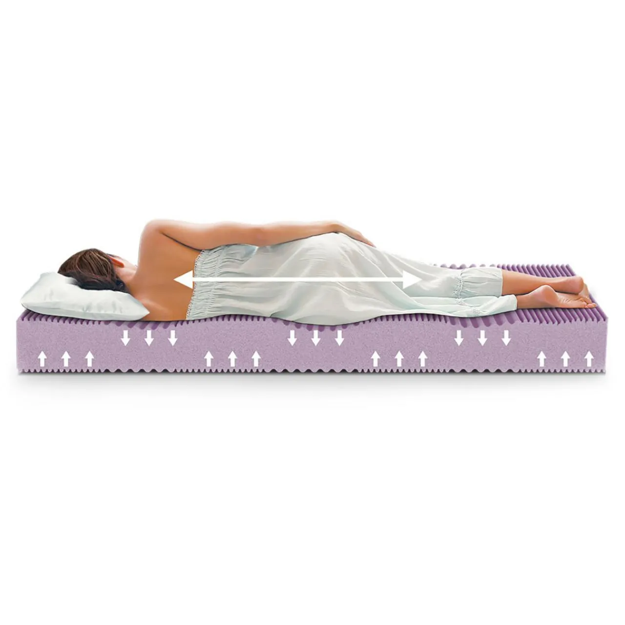 Materac pomaga wyciszyć się przed snem, bo jego profilowana struktura działa jak delikatny masaż. 7 stref twardości zapewnia podparcie każdej części ciała niezależnie od pozycji spania.
