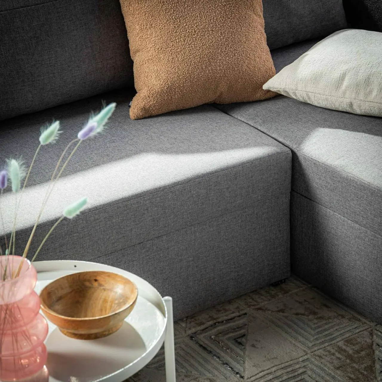 Narożnik został wykończony tkaniną RINO – materiałem o drobnym splocie, w którym nici przeplatają się między sobą, tworząc niejednolitą, unikalną kompozycję. Tkanina dodatkowo pokryta jest specjalną warstwą hydrofobową, która chroni przed szybkim przesiąkaniem płynów.