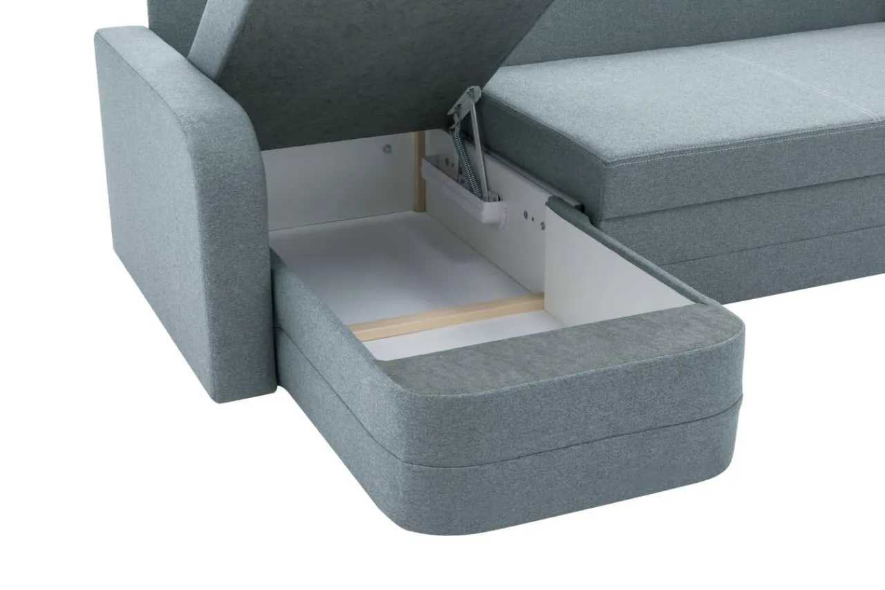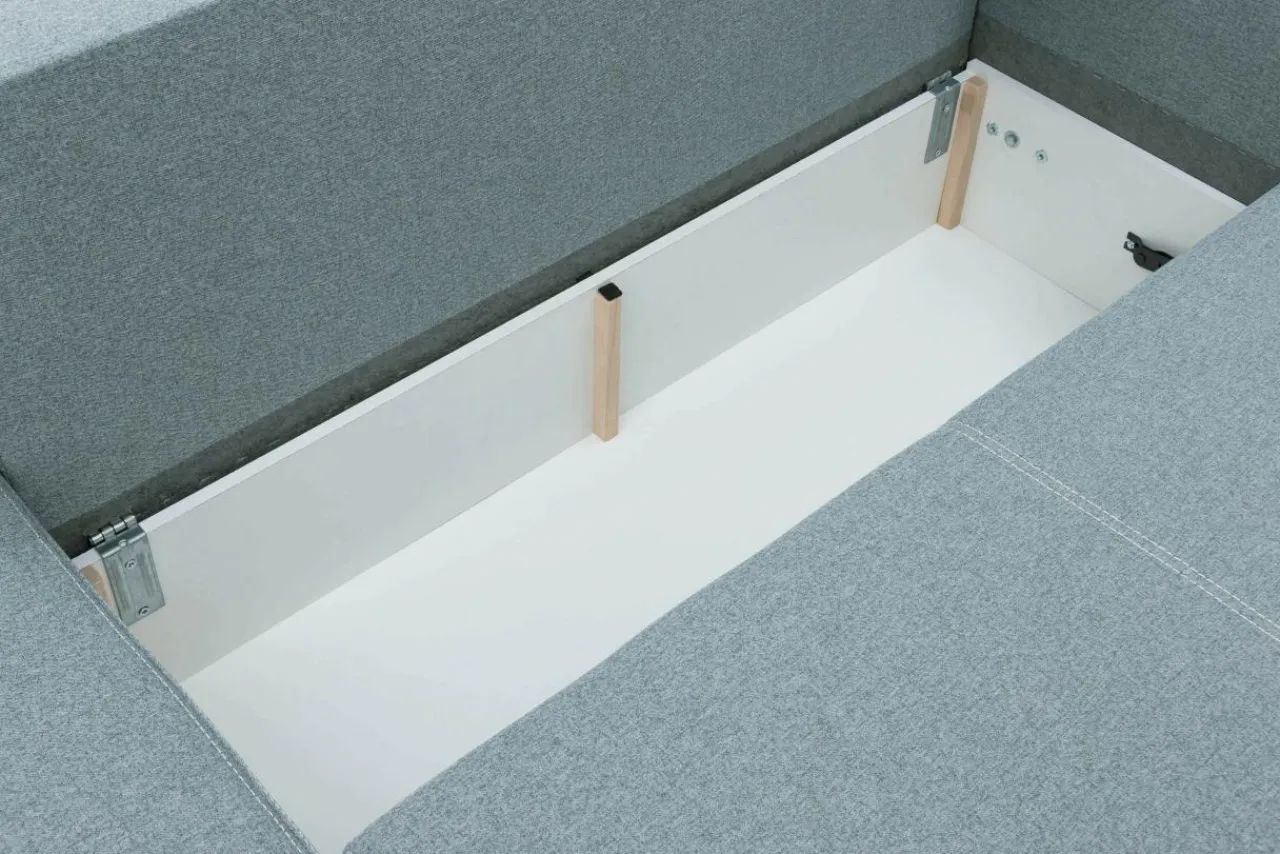 - Dodatkowy schowek znajduje się w bocznej leżance – można schować koce i poduszki nawet, gdy narożnik jest rozłożony.
