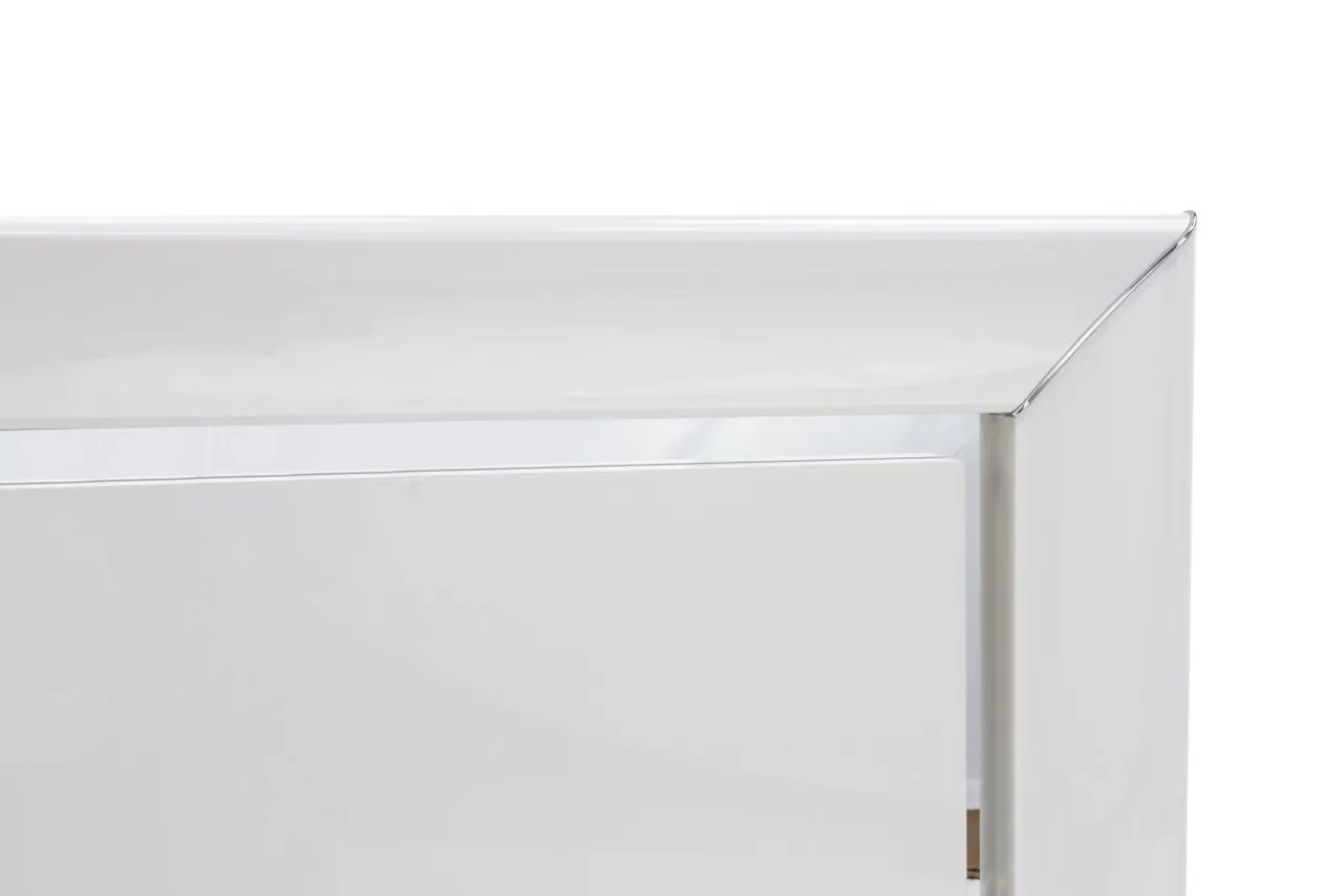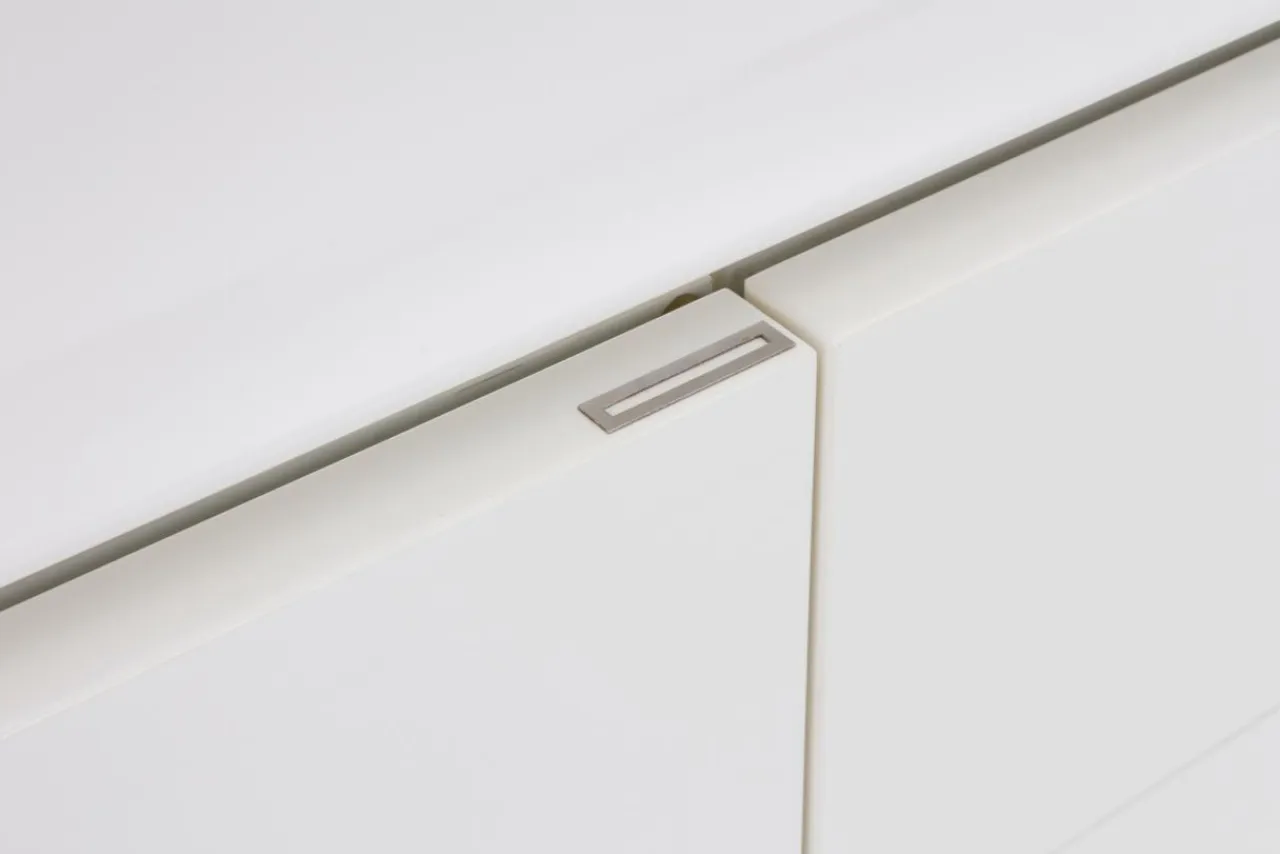 Biała, budząca skojarzenia z luksusem barwa pokrywająca bufet, harmonizuje błyszczącymi elementami w barwie chromu. Wysoki połysk lakieru to cecha charakterystyczna aktualnej, meblarskiej mody. Lśniąca, srebrzysta podstawa podkreśla elegancję i luksusowy charakter bufetu. Niejednolita powierzchnia frontowej części również decyduje o ciekawym efekcie końcowym.