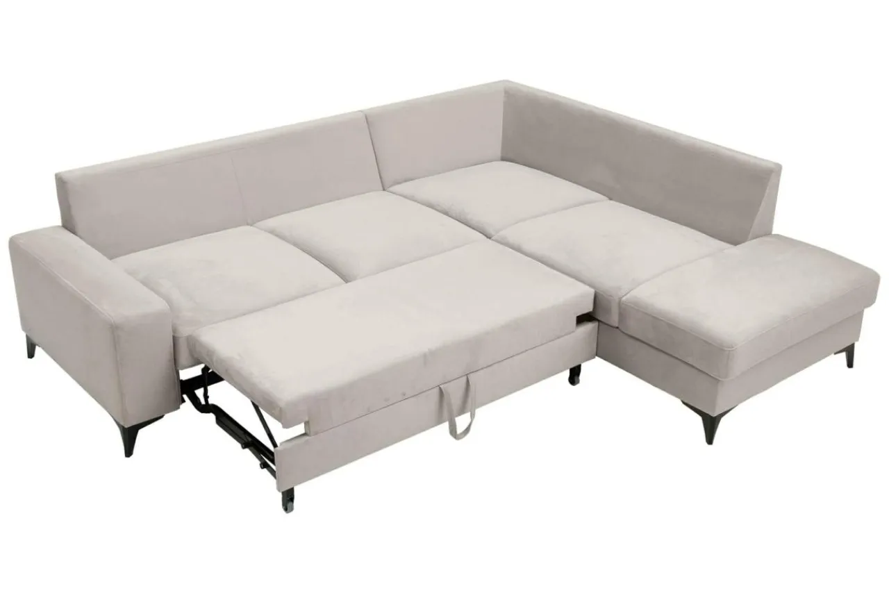 - Narożnik rozkłada się za pomocą łatwego w obsłudze mechanizmu typu delfin – wystarczy lekko unieść siedzisko i je wysunąć, a następnie położyć oparcie;