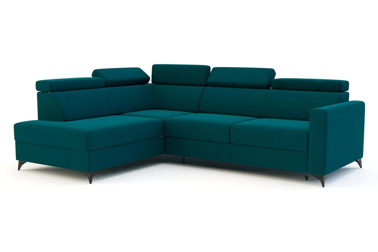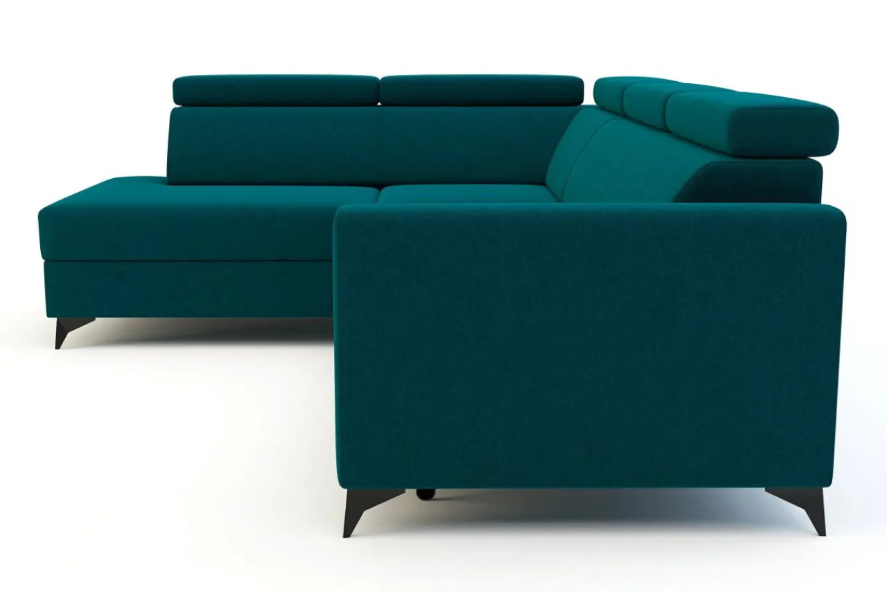 - wysokie nóżki mebla – metalowe, czarne, ustawione pod lekkim skosem sprawiają, że bryła narożnika jest wizualnie lżejsza i lepiej komponuje się z nowoczesnym wystrojem wnętrza