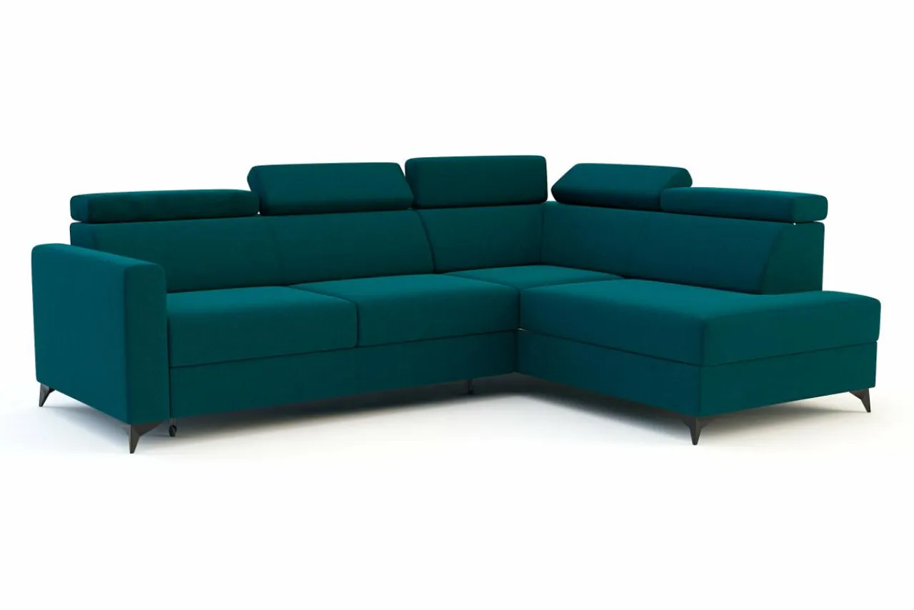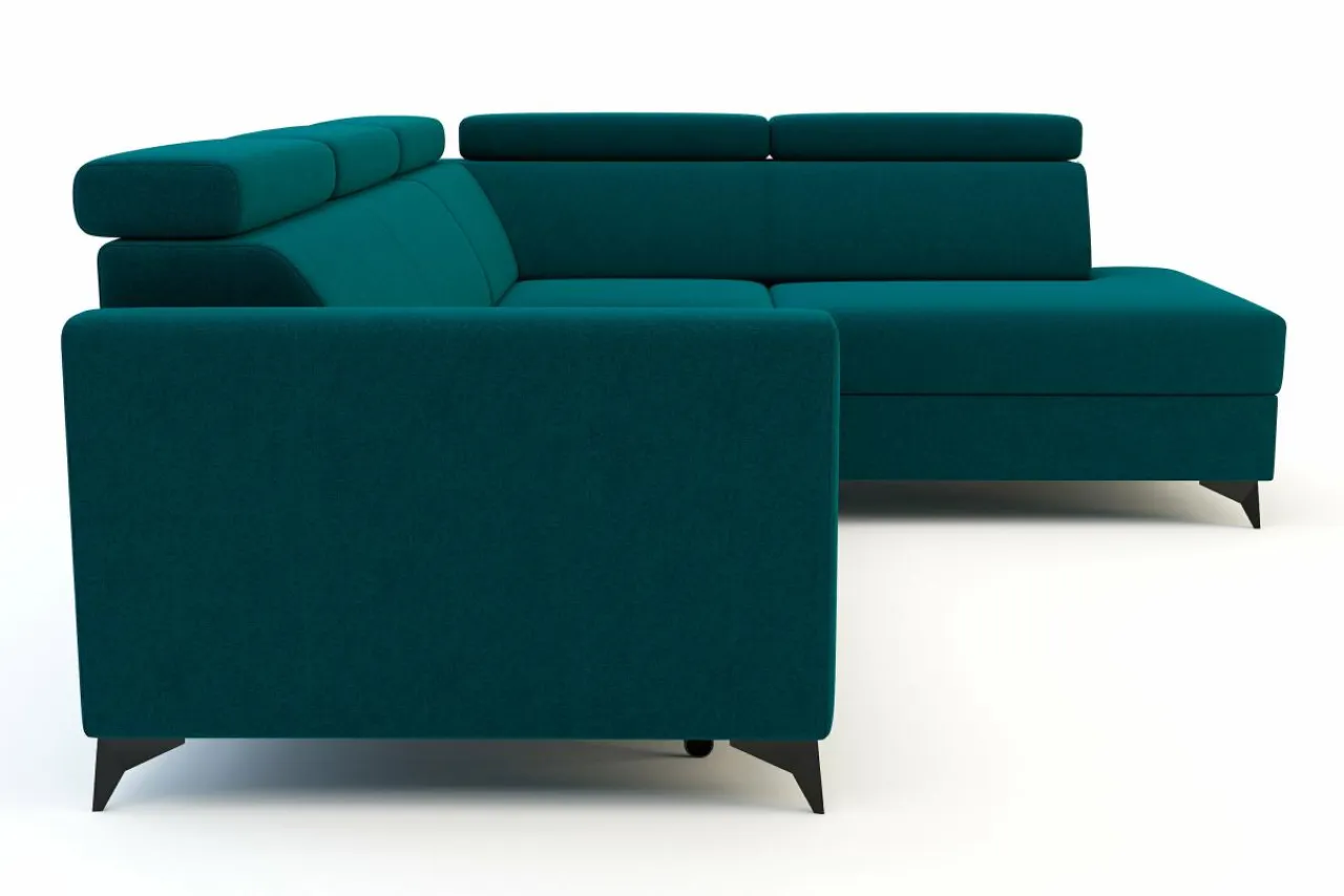 - wysokie nóżki mebla – metalowe, czarne, ustawione pod lekkim skosem sprawiają, że bryła narożnika jest wizualnie lżejsza i lepiej komponuje się z nowoczesnym wystrojem wnętrza