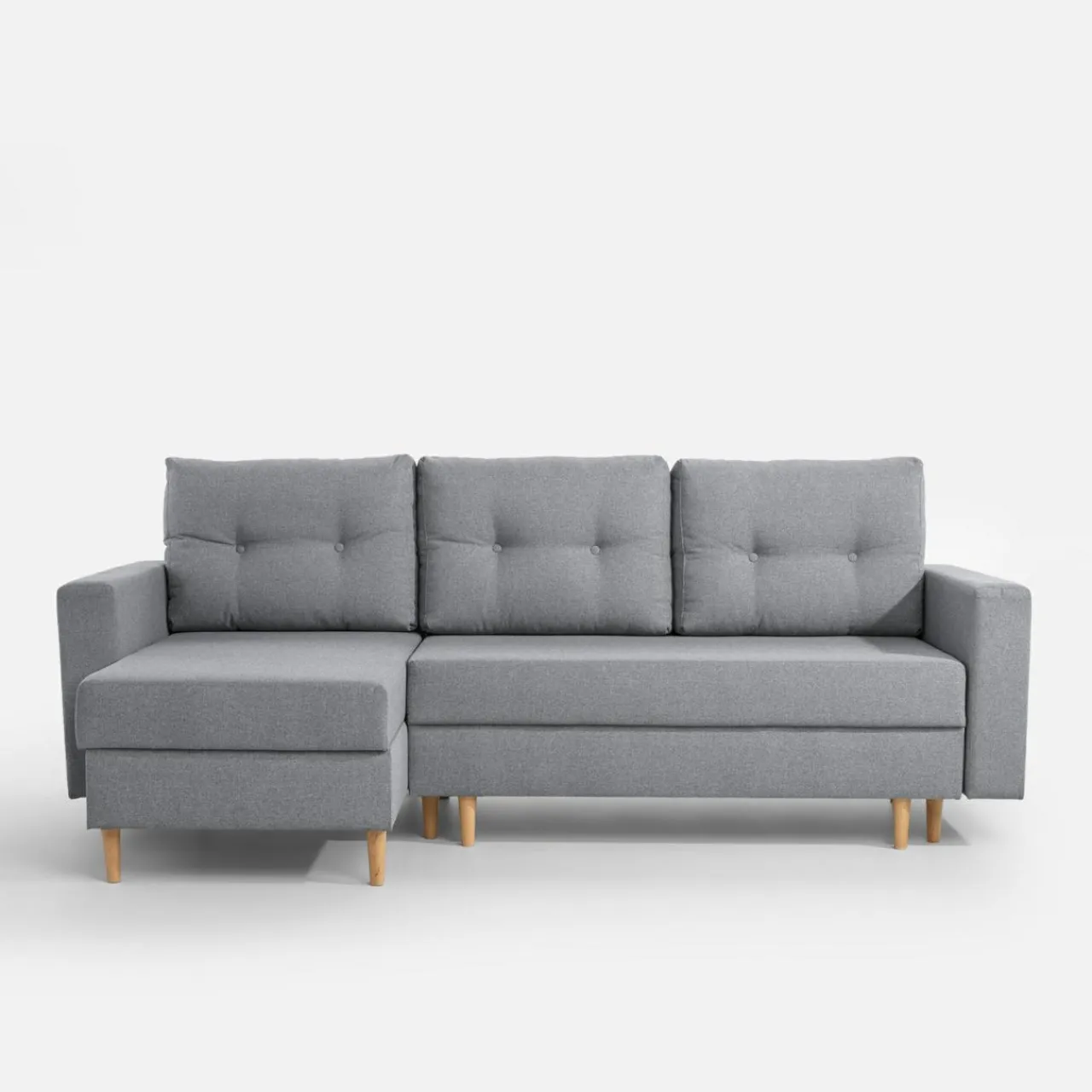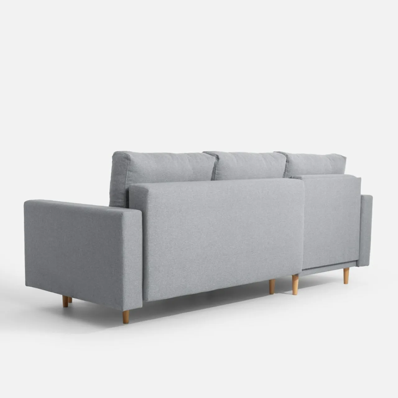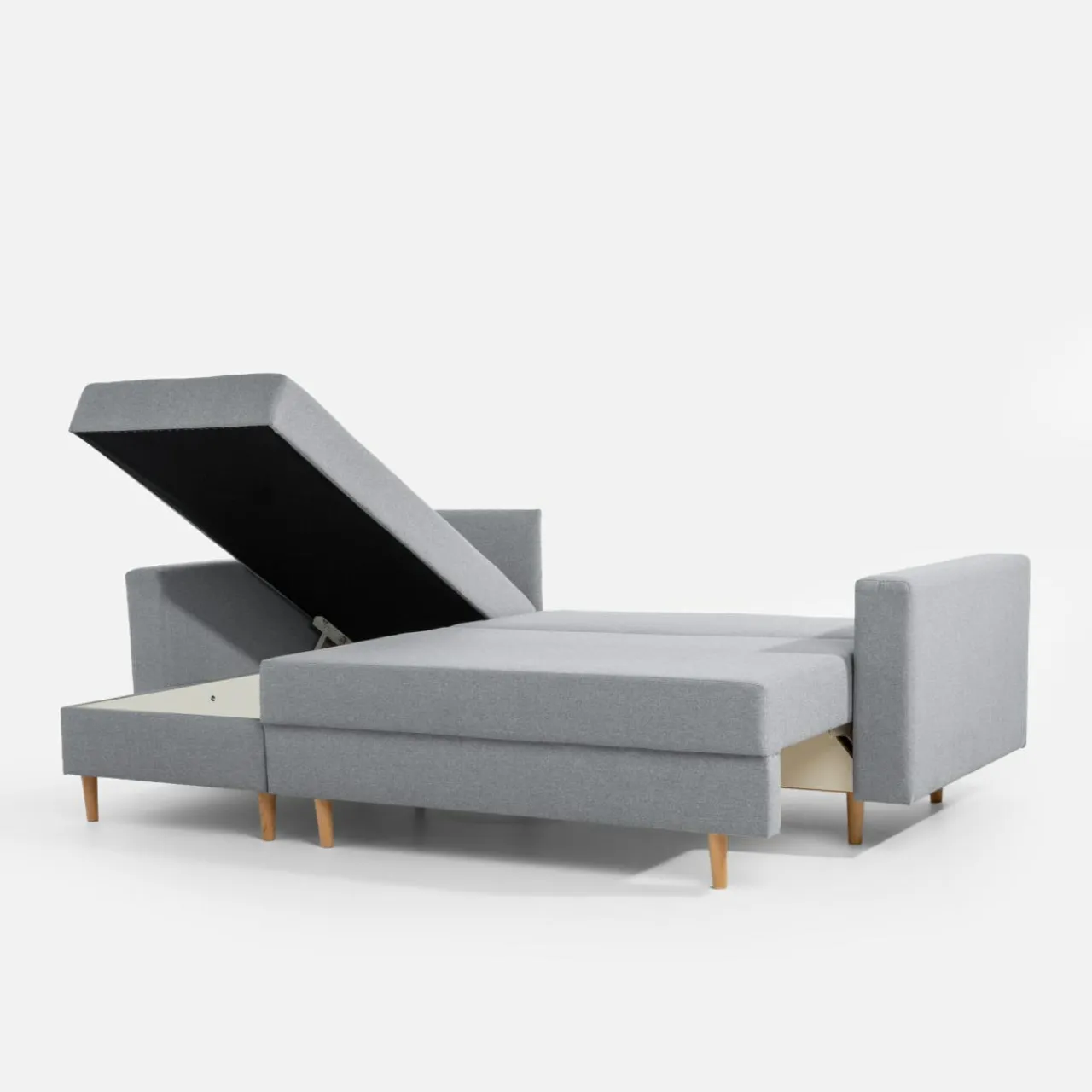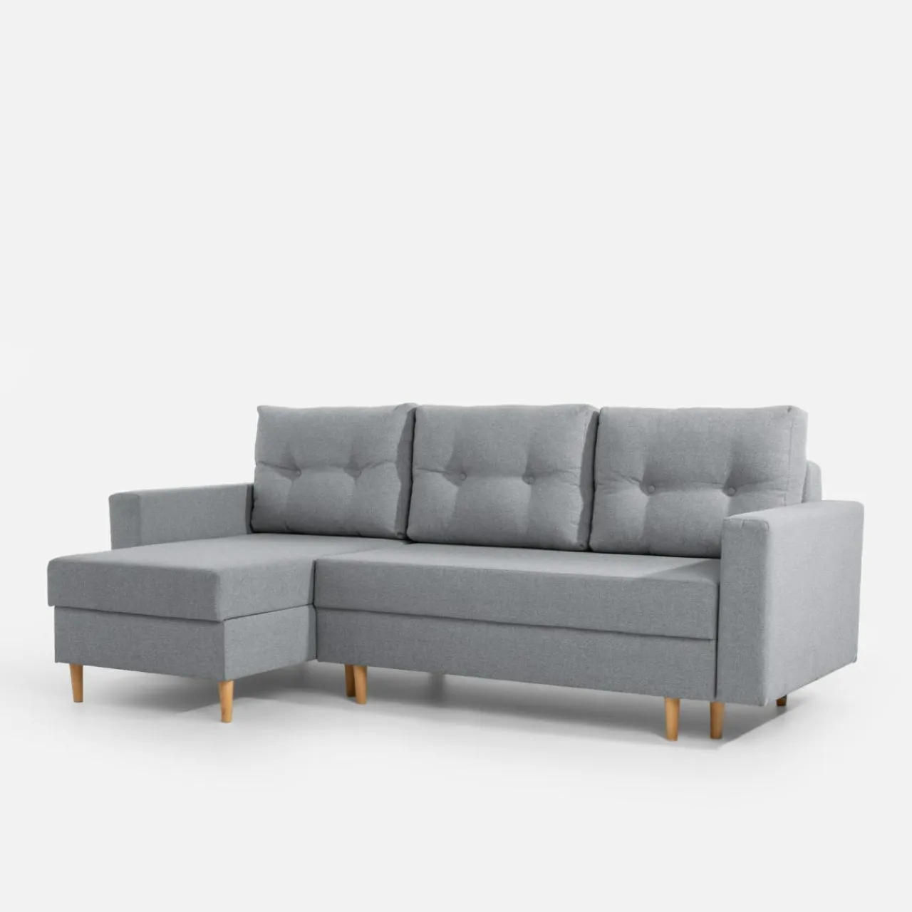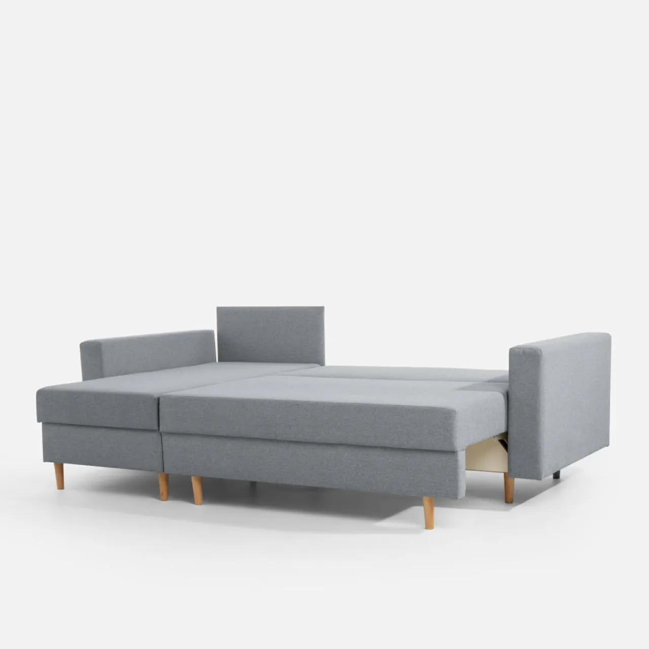 Na dodatkową uwagę zasługują nóżki mebla – wykonane z jasnego drewna bukowego – dzięki którym narożnik będzie pasował do wnętrza w stylu skandynawskim.