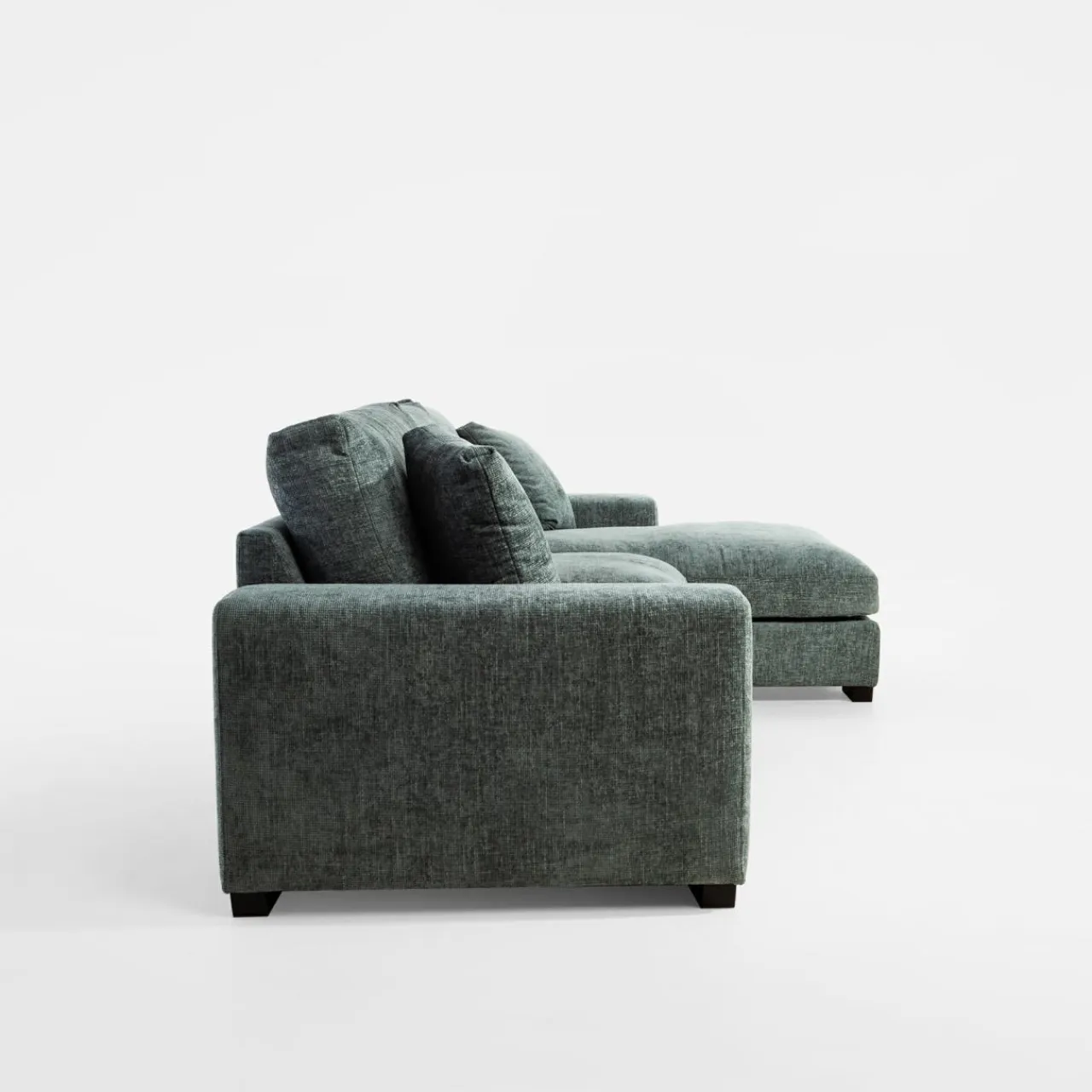 Narożnik pokryto miękkim szenilem MAJESTIC. Tkanina ma lekko wyczuwalną pod palcami strukturę, a nici lekko połyskują i różnią się odcieniem szarości, stąd wrażenie cieniowania i trójwymiarowości.