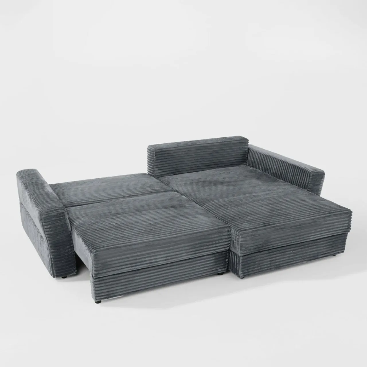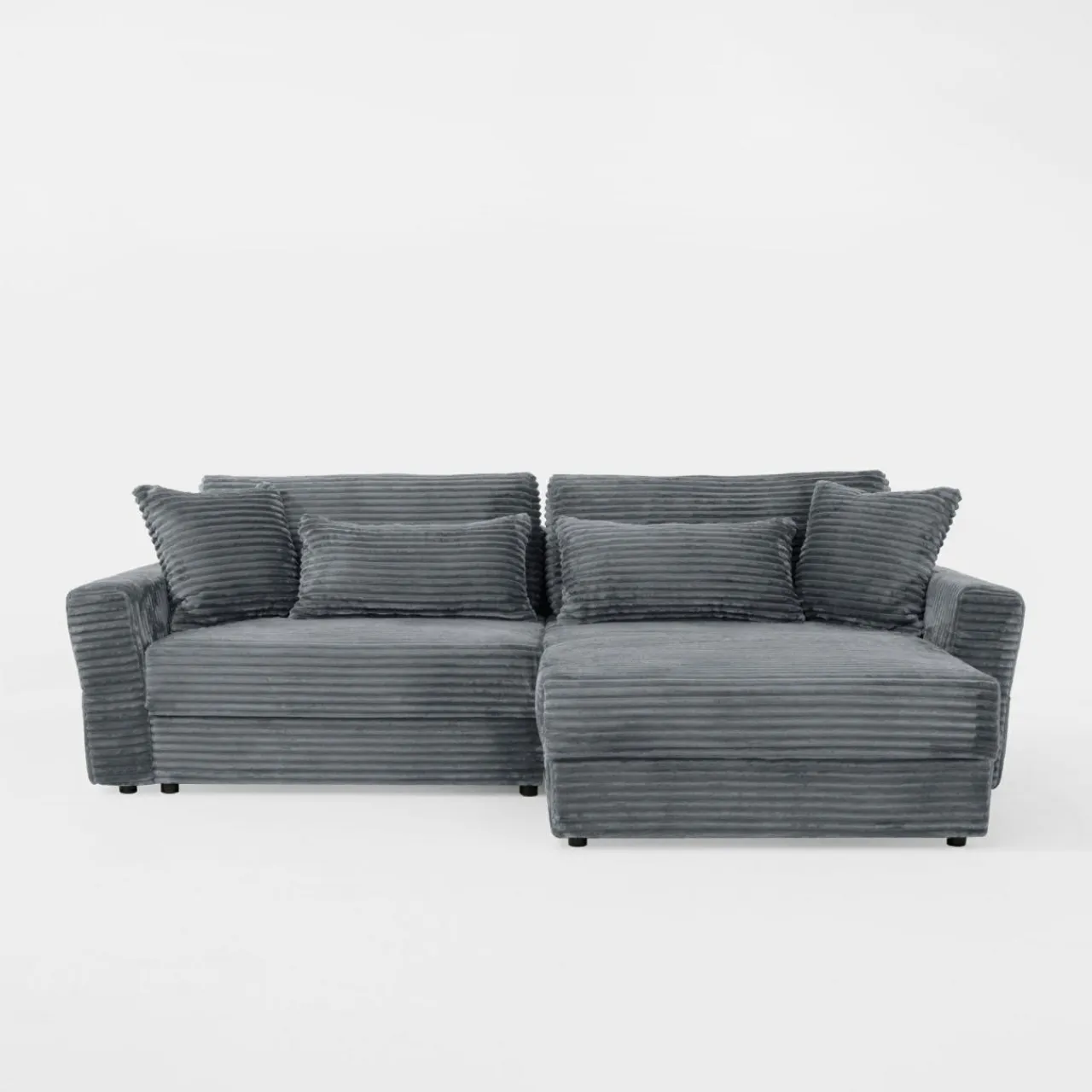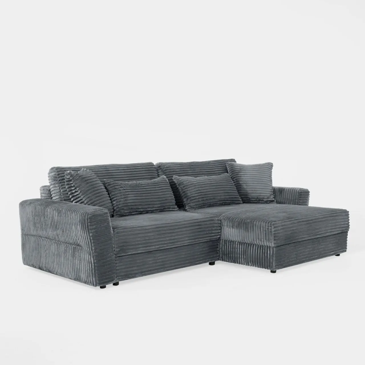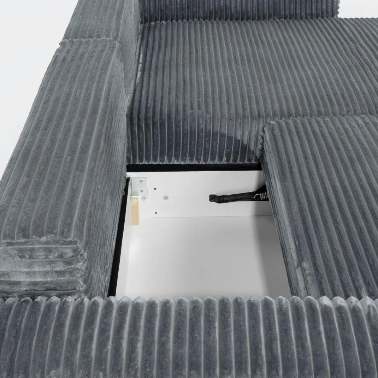 - Narożnik pokryto przyjemnym w dotyku sztruksem – poczujesz przyjemne otulenie podczas picia porannej kawy lub popołudniowej drzemki.