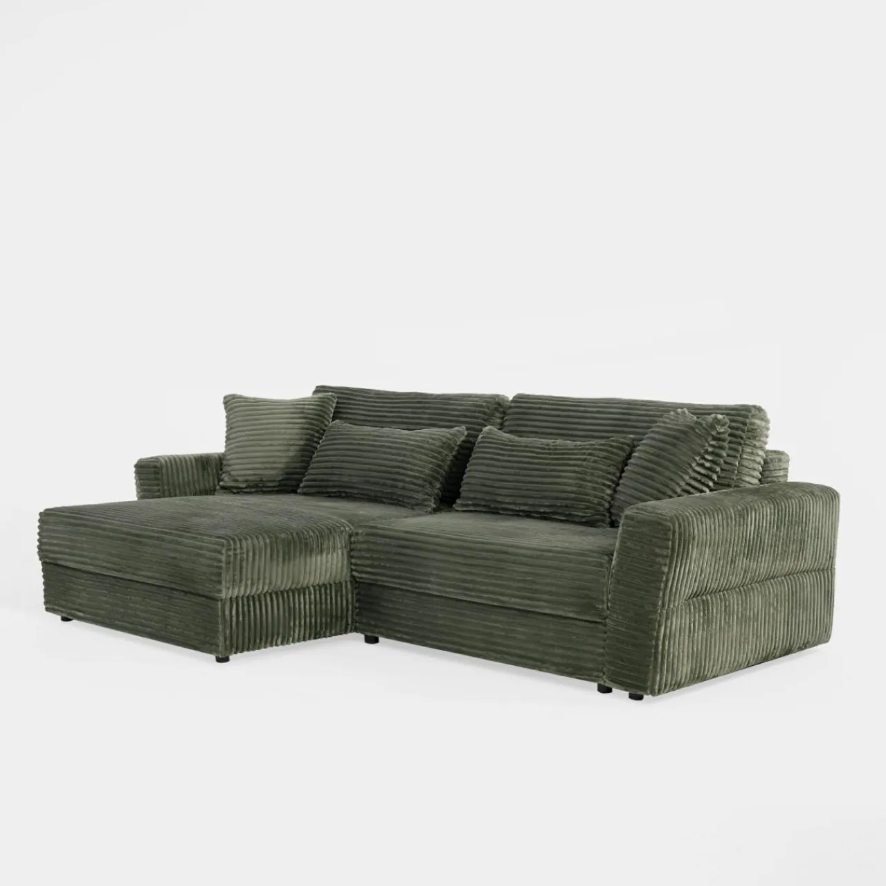 - Narożnik pokryto przyjemnym w dotyku sztruksem – poczujesz przyjemne otulenie podczas picia porannej kawy lub popołudniowej drzemki.