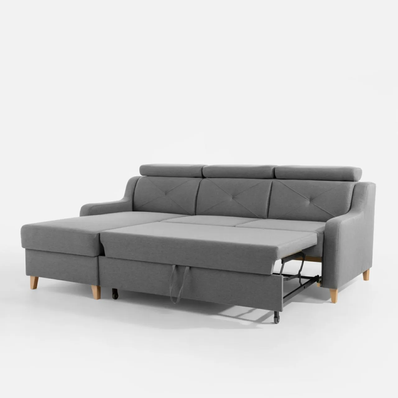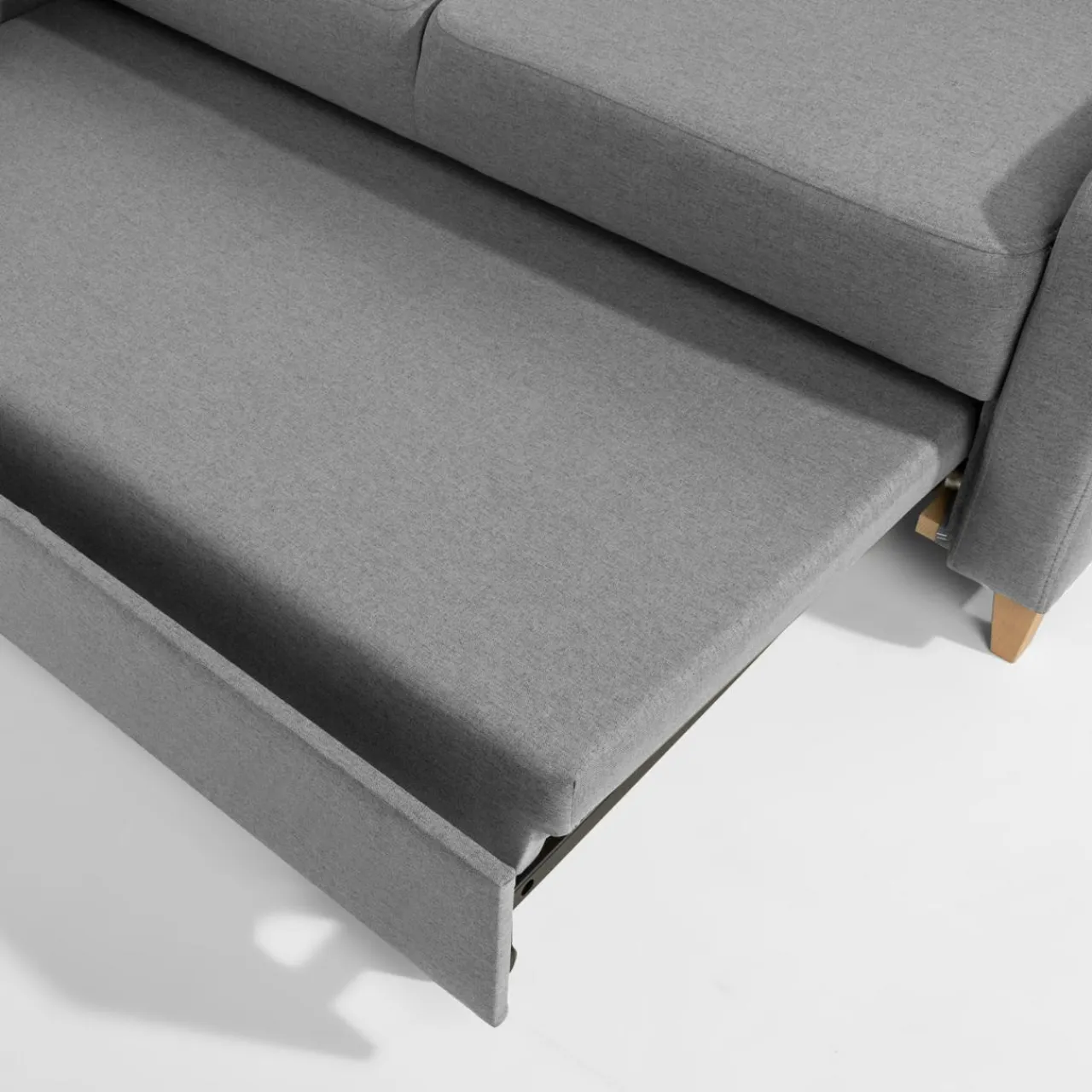 Stelaż pod siedziskiem wysuwamy i podnosimy za pomocą uchwytu. Mebel nie wymaga odsuwania od ściany. Idealny do okazjonalnego spania.