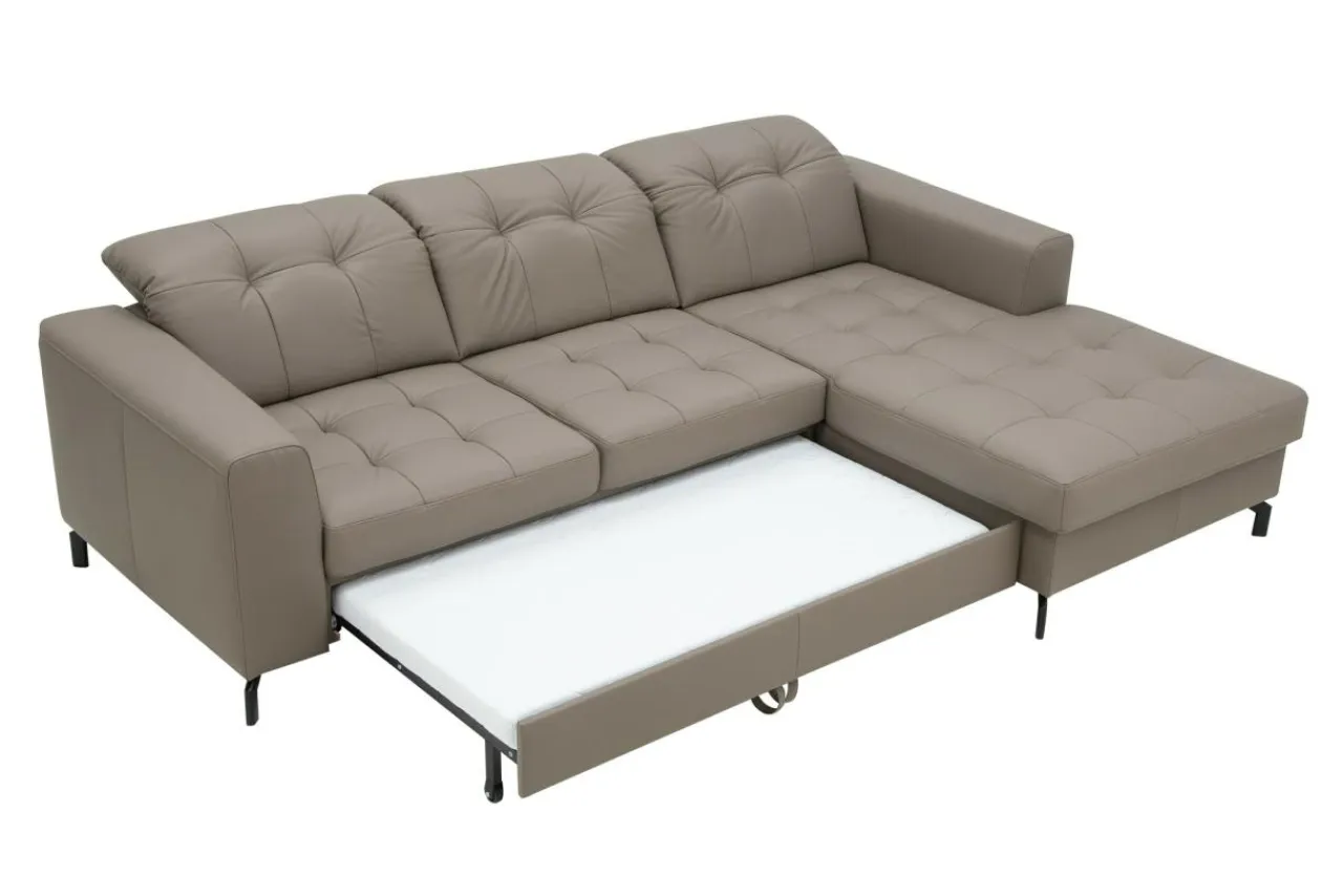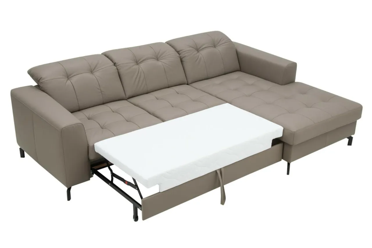 Narożnik posiada system rozkładania typu delfin. Dzięki niemu w prosty sposób uzyskasz dodatkową przestrzeń, którą w razie potrzeby możesz wykorzystać do spania.