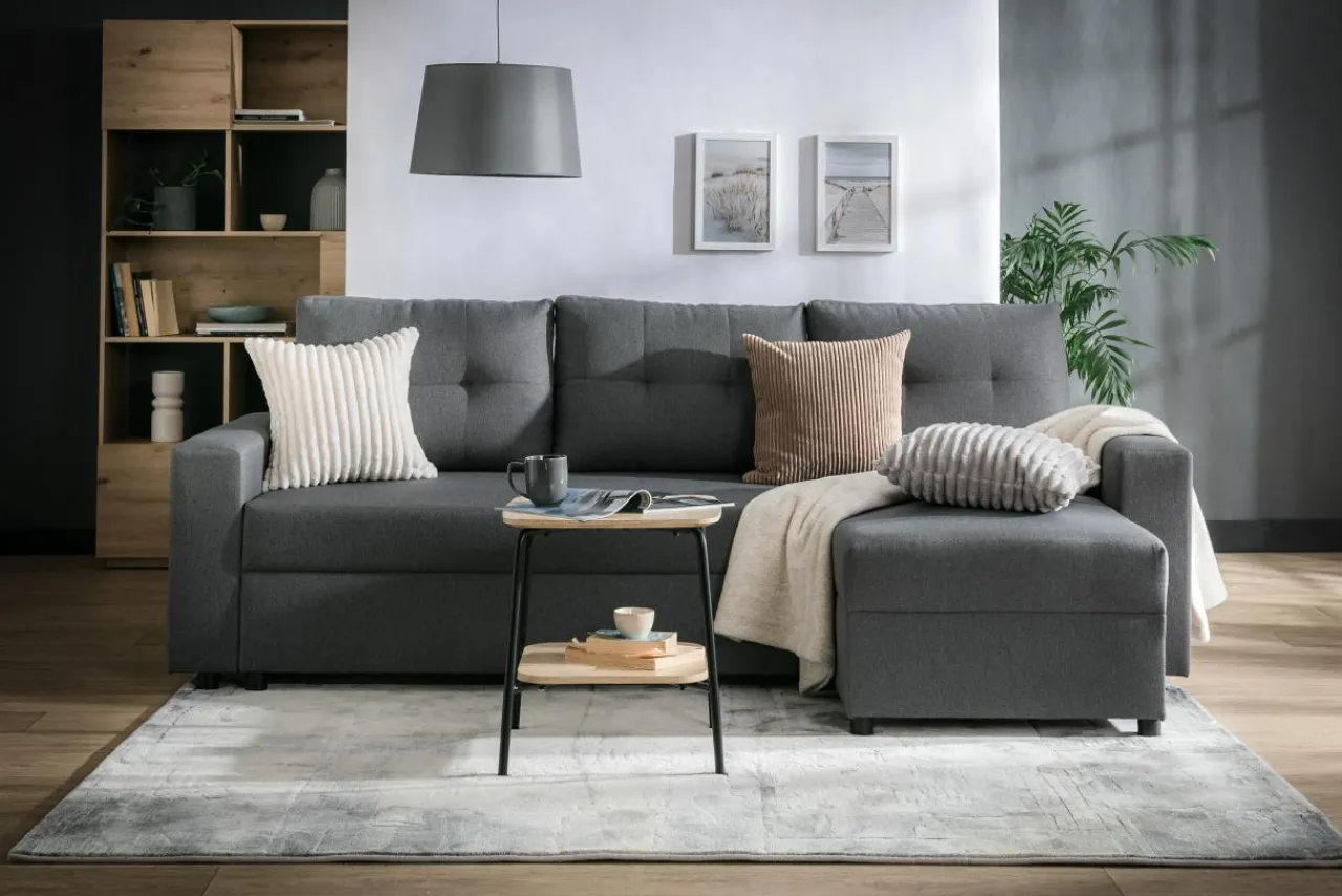 - Narożnik możesz sprawnie rozłożyć się za pomocą mechanizmu DL. Wystarczy unieść i wysunąć siedzisko, a w jego miejsce położyć oparcie.