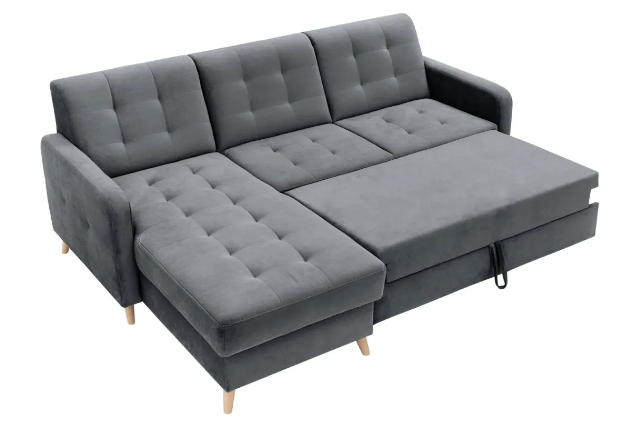 Dzięki zastosowaniu funkcji „delfin”, narożnik VOLARE można łatwo rozłożyć. Wystarczy podnieść i wysunąć stelaż znajdujący się pod siedziskiem.