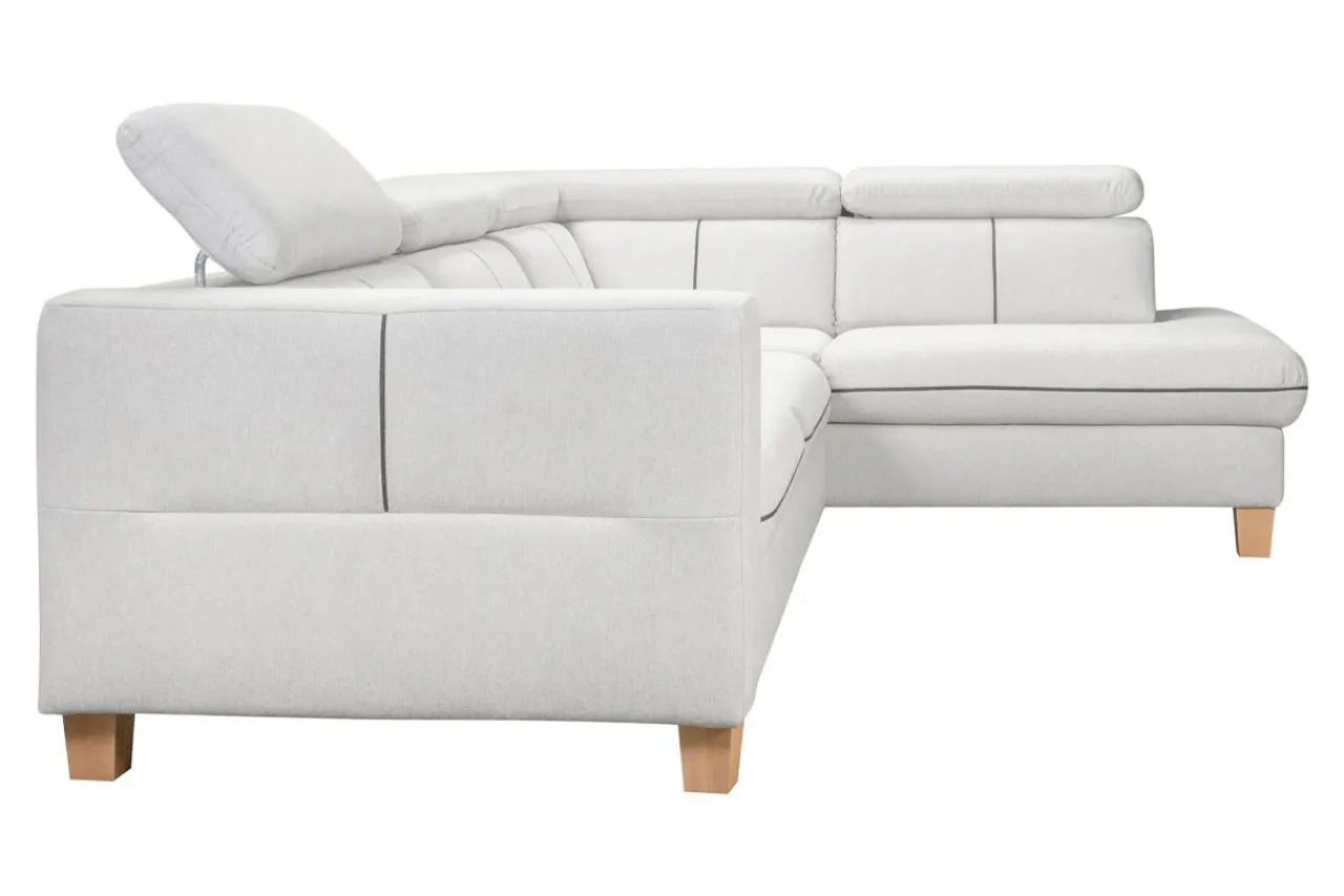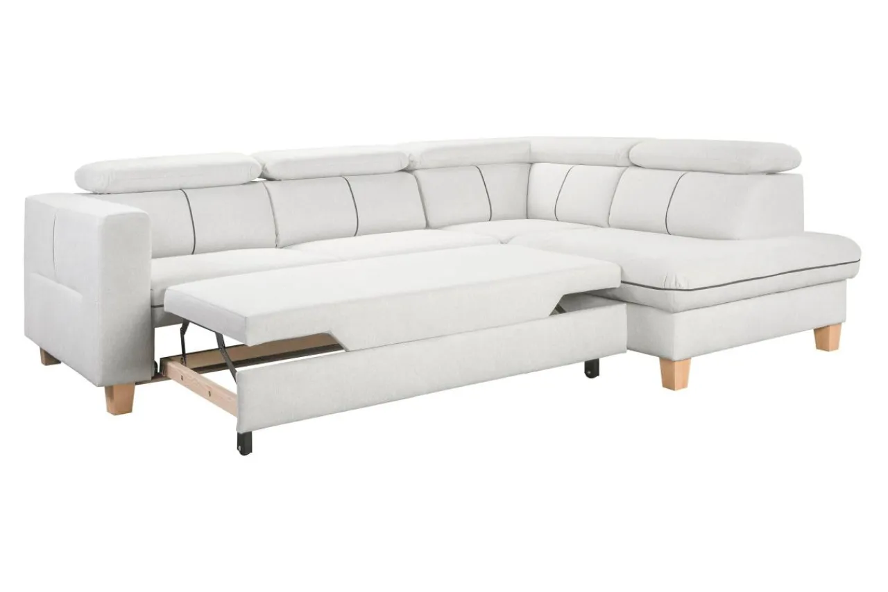 Do obicia narożnika wykorzystano tkaninę POLARIS. Tkanina jest odporna na mechacenie i ścieranie. Jej cechą charakterystyczną jest wyraźny splot nitek, który tworzy interesujący efekt wizualny. Kremowy narożnik posiada wyraziste, szare przeszycia, ładnie komponujące się z drewnianymi nóżkami.
