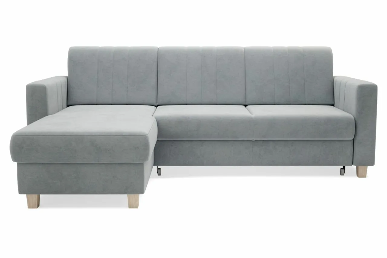 Dzięki szarej kolorystyce i drewnianym nóżkom narożnik możesz wkomponować w nowoczesne wnętrza, wypełnione chłodnymi barwami.