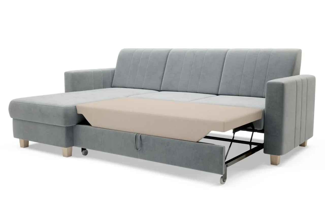 Możesz wysunąć część spod siedziska, by rozłożyć narożnik. Dzięki funkcji DELFIN, nie musisz przy tym odsuwać narożnika od ściany. Na powierzchni spania – 117 cm x 196 cm możesz przygotować posłanie dla gościa.