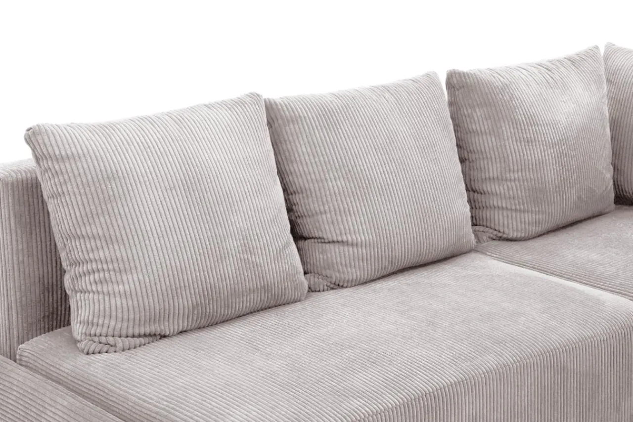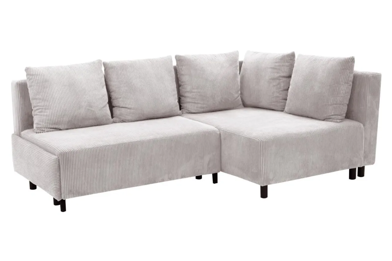 Narożnik w jasnoszarym kolorze przyciąga wzrok miękką, sztruksową tapicerką.