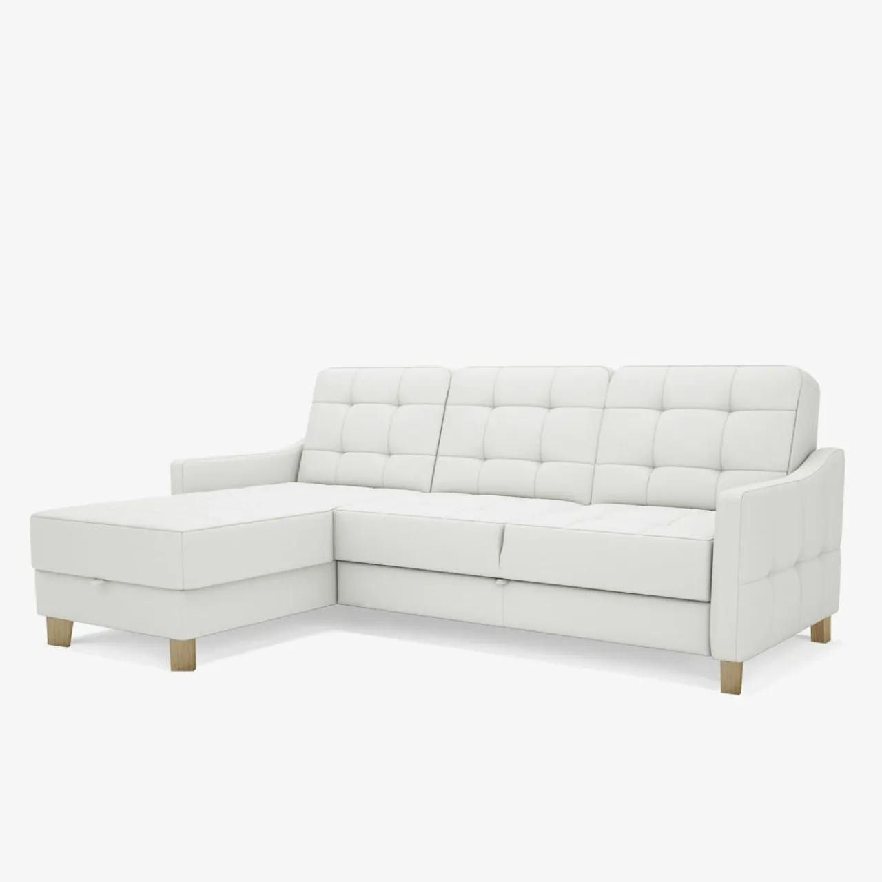 Komfortowy narożnik Malmo wykonany w całości ze skóry naturalnej to propozycja do salonu. Biały kolor rozjaśni optycznie pomieszczenie. Skóra naturalna podnosi prestiż, jest też bardziej elastyczna aniżeli tkaniny dzięki czemu bryła nabiera bardziej eleganckich kształtów. Model wyróżnia się ciekawym pikowaniem niemal na całym narożniku, siedzisku boku i oparciu narożnika. Wysokie oparcie ułatwia znalezienie właściwego podparcia pod głowę. Za komfort siedzenia odpowiadają sprężyny faliste z dodatkiem pianek. Jeśli zajdzie potrzeba przyjęcia gości na noc nie będzie z tym problemu gdyż jest wyposażony w funkcję spania i pojemnik na pościel. Nóżki drewniane w kolorze buk naturalny idealnie komponują się z jasnym kolorem tapicerki. Niewątpliwą zaletą jest uniwersalność do pierwszego montażu narożnika dzięki czemu właściwą stronę można zmontować już w domu.