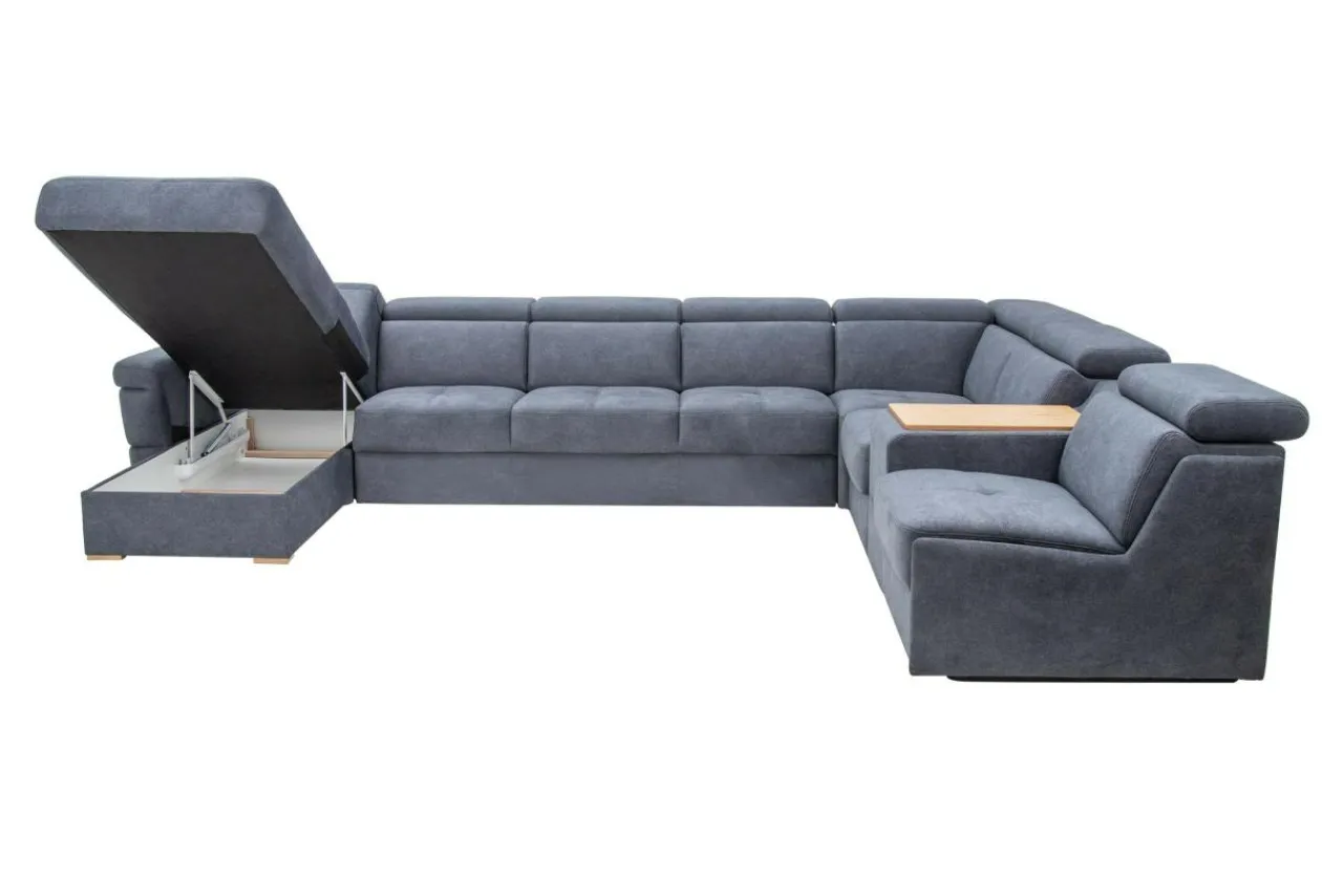 Jednym z modułów narożnika jest sofa o szerokości 199 cm, na której możesz wygodnie położyć się w ciągu dnia. W razie potrzeby sofę rozłóż sofę i zaproś gości. W rozłożeniu sofy pomoże Ci funkcja leopard. W pojemniku znajdziesz miejsce na koc lub ozdobny pled.