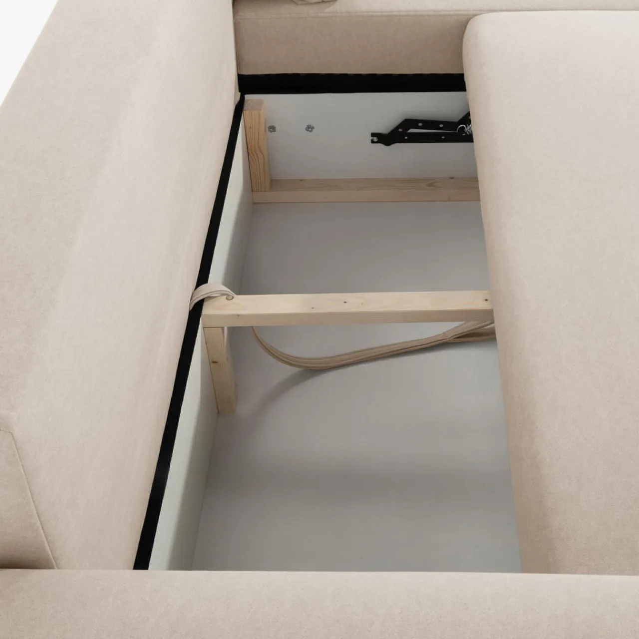 - W pojemniku pod siedziskiem wygodnie przechowasz pościel, koce lub inne domowe tekstylia. Dostęp do niego uzyskasz podczas rozkładania narożnika.