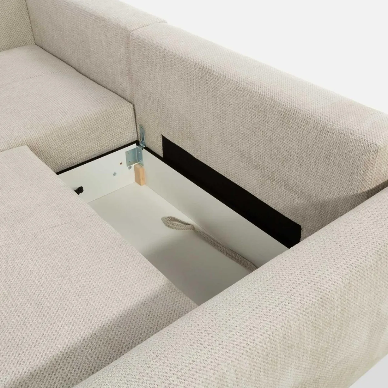- Pojemnik pod siedziskiem to dodatkowa przestrzeń, którą wykorzystasz na pościel i inne domowe tekstylia. Dostęp do niego uzyskasz podczas rozkładania narożnika.