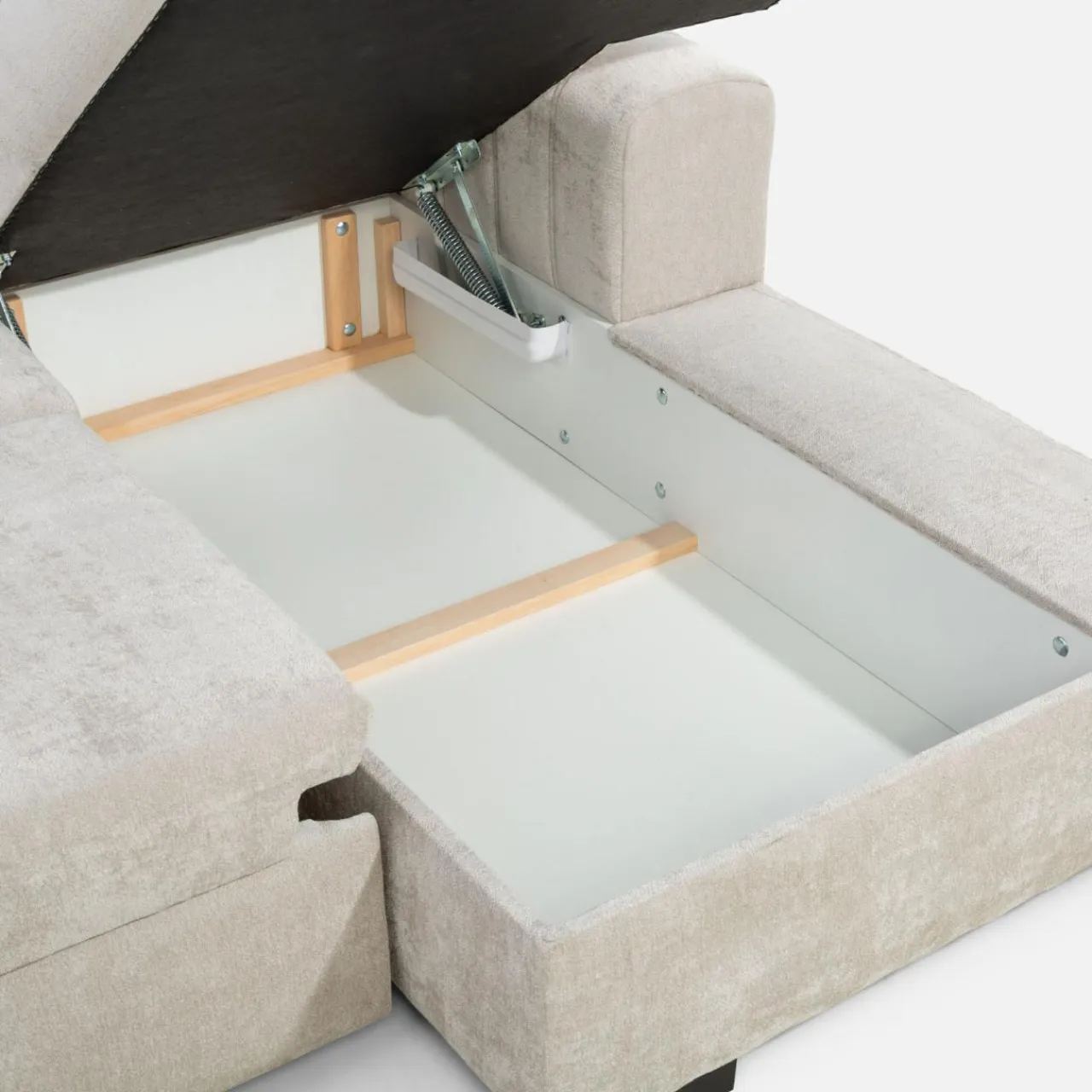 - Pojemnik w leżance da przestrzeń na pościel lub inne domowe tekstylia.