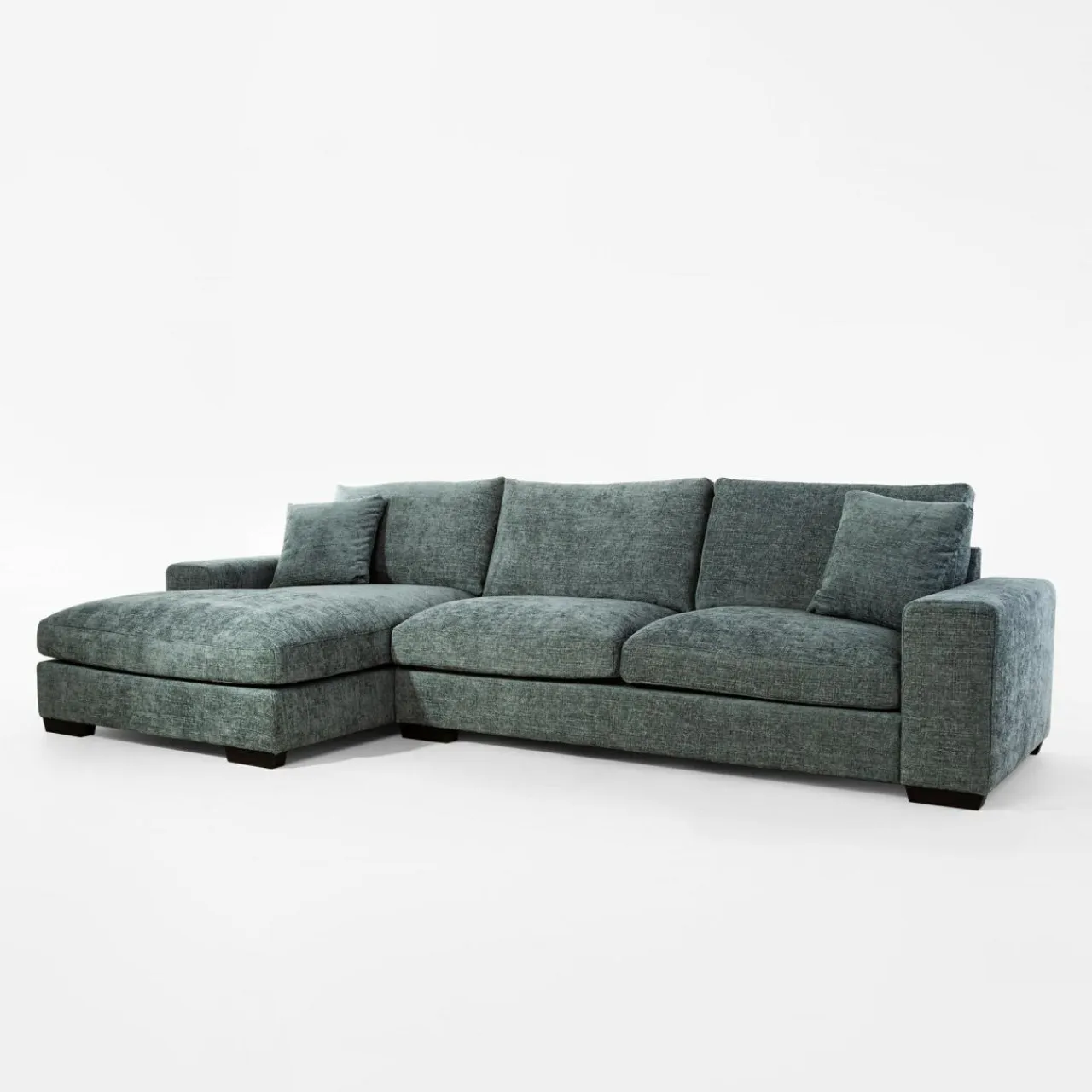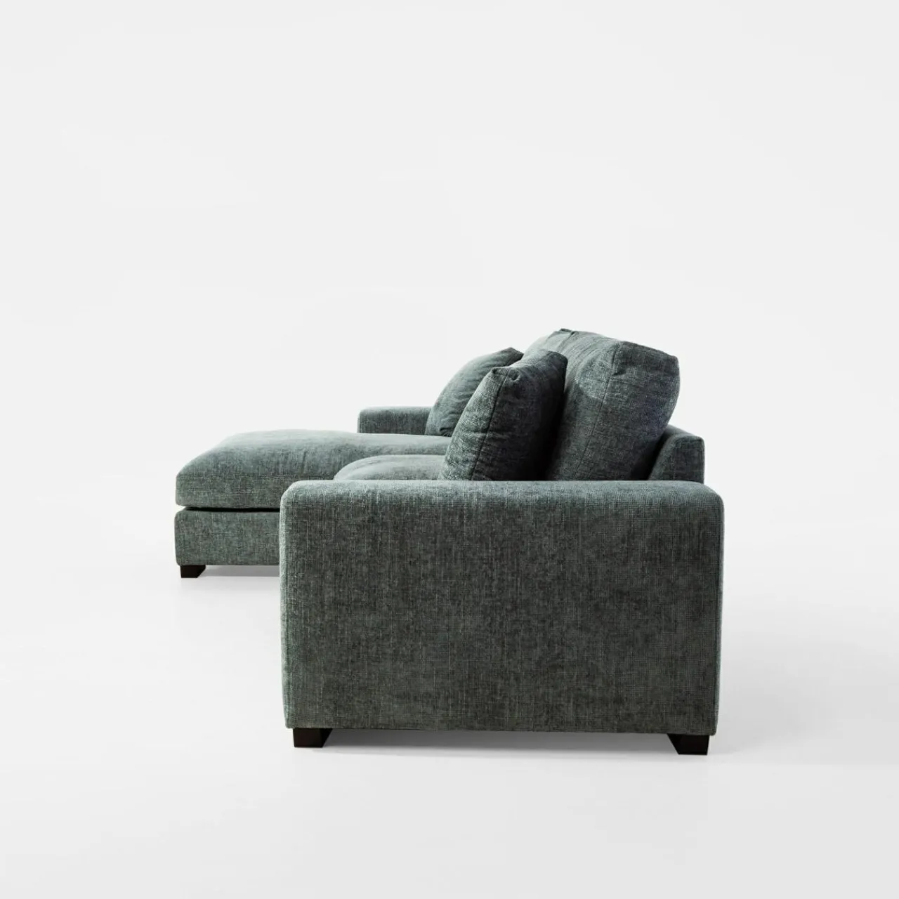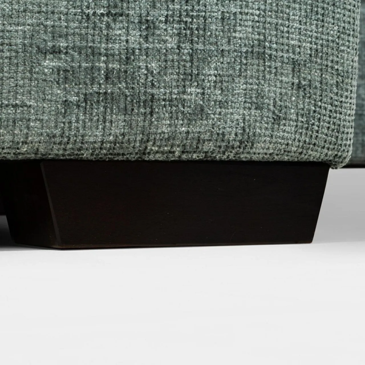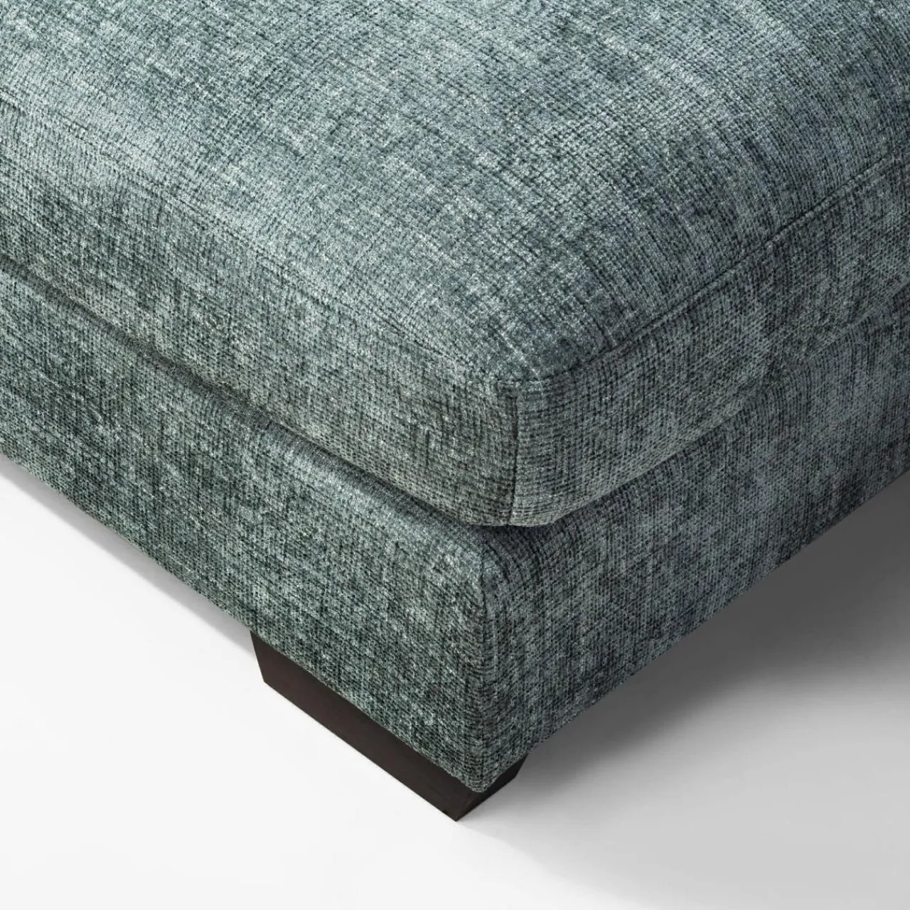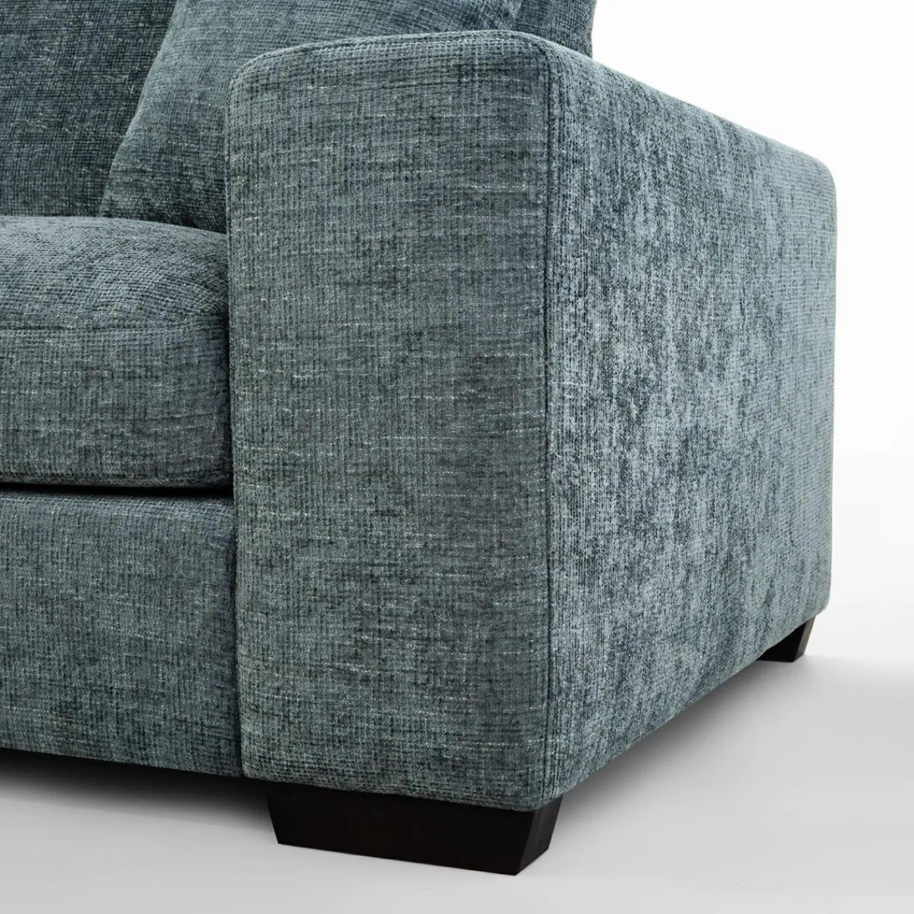 Narożnik pokryto miękkim szenilem MAJESTIC. Tkanina ma lekko wyczuwalną pod palcami strukturę, a nici lekko połyskują i różnią się odcieniem szarości, stąd wrażenie cieniowania i trójwymiarowości.